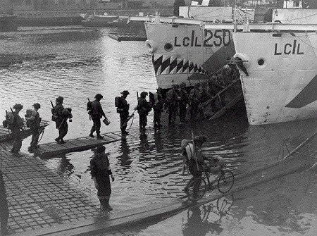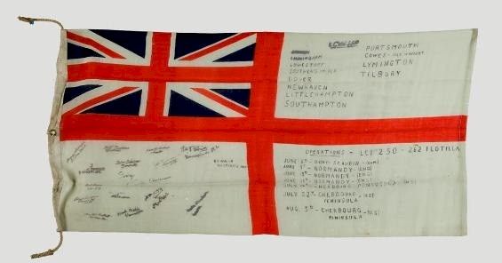 Crew members of landing craft LCI(L) 250 signed this White Ensign (bottom left) and used it to record details of their home ports and operations. Part of the Canadian 262nd Flotilla, LCI(L) 250 was based in a variety of English ports (top right). On D-Day, it landed members of the Highland Light Infantry of Canada on the beach at St. Aubin, striking a German mine in the process. In June, July, and August, 250 transported British and American troops to locations in Normandy. Source: Canadian War Museum CWM 20050060-001 Courtesy of the Canadian War Museum