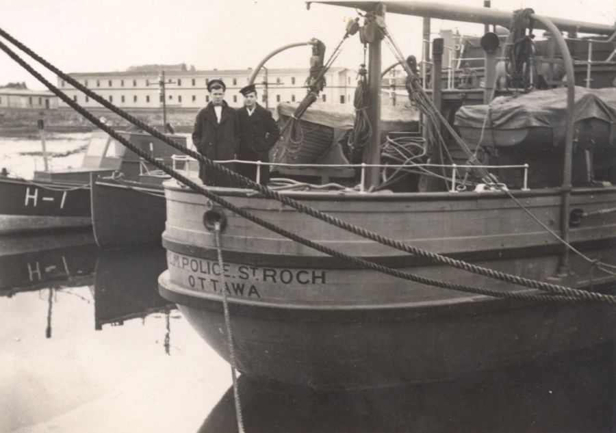 Sailors off HMCS QUINTE on the quarterdeck of the RCMP vessel St. Roch at Lunenburg, NS. The buildings of Camp Norway are in the background From the collection of Ross (Sandy) Somerville, Leading Coder, RCNVR