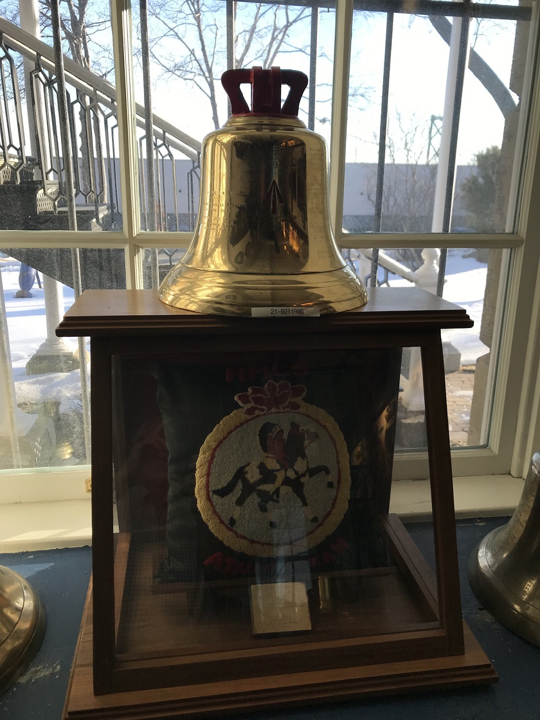The ship's bell and captain's cushion for HMCS ATHABASKAN R79 / 219 is on display at the Naval Museum of Halifax, CFB Halifax, NS. The plaque on the right acknowledges the presentation of the cushion to the Captain's Cabin from Captain Gordon L. Edwards. The cushion was made by Able Seaman G.L. Edwards in Athabaskan 219, October 1951.