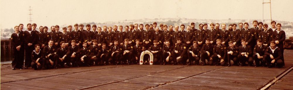 (1) Vail, Roger, ER (2) Lavers, Keith (Red), ER (3) Bayne, Mark, ER (4) Brice, Neil, ER (5) Heppleston, Pete (Hollywood), ER (6) Gordon, Jim, (Lucky) Sonarman (7) Marsaw, Dean, (NASA), FC (8) Grey, Brian (Creepin Jesus), ET (9) Simard, Marcel (Rene) (10) Desrosier, Yvonne (Rosie), ER (11) Miles, Ron (12) Hewitt, Jim, ET (13) Parker, Ron (Picker), ET (14) Post, Johann, ER (15) MacLean, Bruce (16) Renner, Paul, Chief ET (17) Halvorson, Tony (18) McNutt, Dave, RM (19) Allard, Moe, RP (20) Fry, Fred (9 Toed Sloth), ER (21) Whelan, Richard (Boomer) (22) Fraser, Robbie (Wobbie) (23) Hassam, Eric (24) Bowen, Peter (25) McKenzie, Ian, Lt (RN) (26) Sullivan, George, Cox'n (27) Stubberfield, Ian (Stubby) (28) Keast, Joe, ER (29) Reid, Dan (30) Gendron, Claude (Buzzard), Chief CK (31) Unknown (Billy Whizz), RN Chief (32) Grant, Jim (General), ER (33) Ferguson, James (CO) (34) Clahane, John (Clahaney), ER (35) Caldwell, Dave, ER (36) Walsworth, Nigel (Baby Duck), ET (37) Leprade, Andre (Cecil B. De Mille) (38) Unknown, WR (39) Irvine, Shane, CK (40) Poirier, Gilles, ER (41) Braun, Peter (Blotto), RM (42) Cummings, Dale (Diesel Dale) (43) Beck, Lennie (44) Mineotas, Victor, STWD (45) Farler, Tim, ET (46) Langlois, Andre (47) Ashling, David (Bob Scratchit), Lt (N), EO (48) Galley, George, RN Chief (49) Smith, Larry (Smudge), ET (50) Byzewski, George (Bazoo) (51) Stubner, Joe (Crazy Joe) (52) Elliott, Bill (Wild Bill), CK (53) Campbell, Dwight (Soupy) (54) Bimm, Bill, NS (55) Houle, Barry, Lt (N) (56) Allen, Jake (Jake the Snake) (57) Stiles, Ted, Lt (N), CSE (58) Smith, Alfred, Slt, Electrical Officer (59) Hogg, Don, MA (60) Kolodji, Ron, ER (61) Bowie, Bob (Zowie Bowie) (62) Lyle, Ron (63) Tasker, Tny, Lt (N)