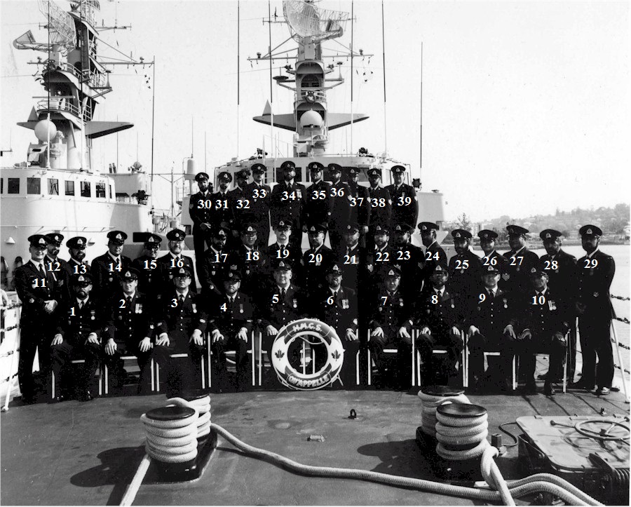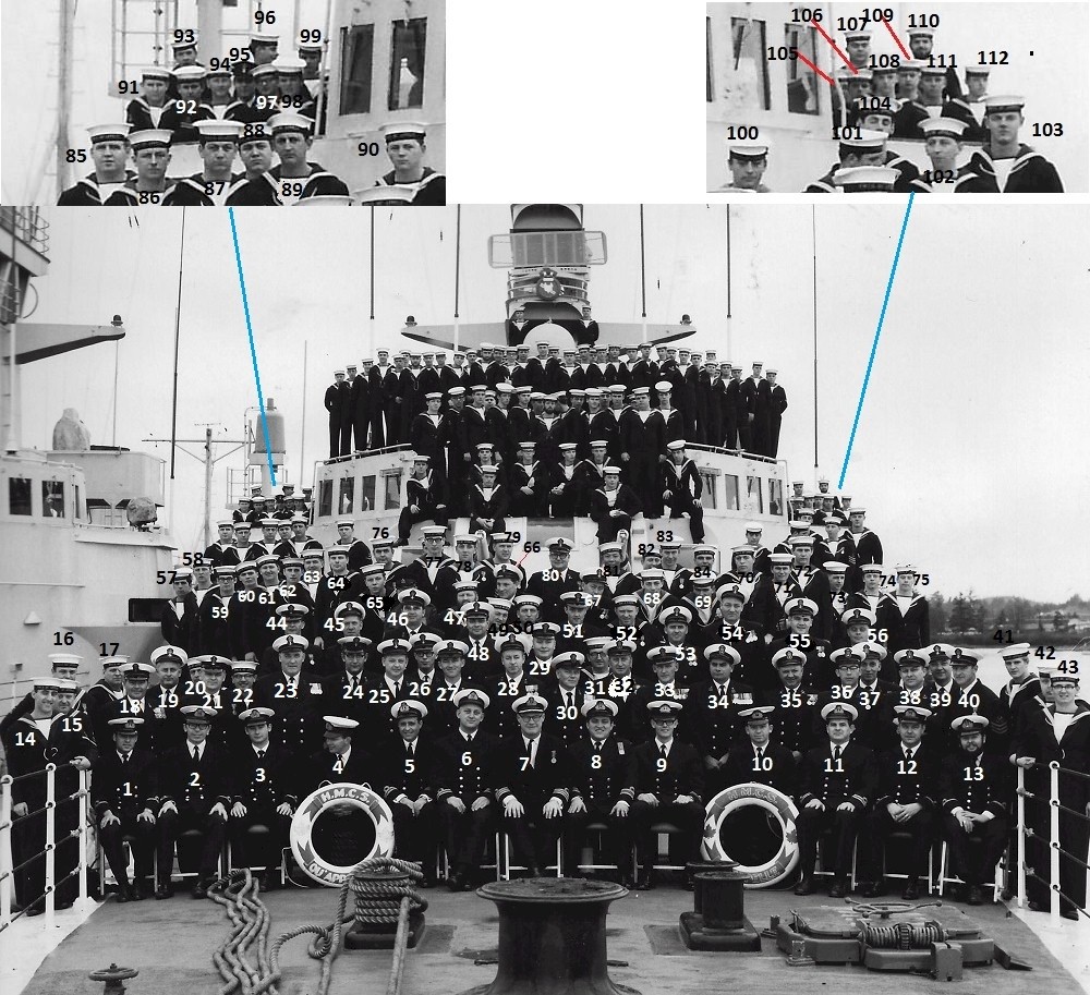 (5) Kilner, John, Lt, Weapons O (7) Allen, John (Jock), Cdr, CO (8) Godbout, LCdr, XO (15) Identified as Hill, P2RP or Allcock, Ron, LSWS (18) Jenkins, P1BN (20) Schauer, P2ER (22) Sparrow, Ken, P2ER (23) Hargraves, P1SM (24) Pfister, P1ER (25) Campbell, Hope, P1SN (26) Reitsma, P2SG (27) Perissini, Lou, C2ER (28) Hooper, C1RP (30) Gustavson, C1ER (31) Grass, LS.HT (32) Shaw, C2BN (33) Davidson, C2LT (34) Sprauge, C2SN (35) Hoffman, P1WU (38) Baltimore, P1RM (40) Rosenfeld, P1RM (42) Gjesdal, ABSN (43) Biccum, ABRP (44) Webb, Edward Frank (Ted), P1ER (46) Lister, P1ER (47) Cross, P2WS (50) Topping, P2BN (52) Nicol, LSSN (53) Presley, P1ER (54) Sears, P1WS (55) Young, P1FC (56) Rayment, P1SG (58) Jankowski, ABSN (61) Hamilton, ABSN (62) McCabe, ABBN (66) Mayo, P2NS (67) P1RP Kobyashi (70) Dykstra, LSSN (79) Pearson, P2.SN (80) Boomer, P1FC (81) Chan, P2HT (84) Fransden, Bob, LSBN (89) Brown, LSSN (90) Hleuka, LSWS (103) Menzies, ABWU (114) Lumley, ABWS (129) Martel, Raynald, SN (140) Hlasny, P2LT (141) Irvine, P2BN (144) Logan, LSRP (147) Kelly, LSRP (150) Reeves, ABRM (151) Gibbon, ABRM (152) Carpenter, ABSN (165) Storey, ABSN
