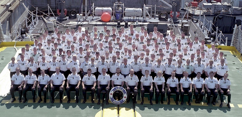 HMCS REGINA 334 circa 2002 Click on the above photo to view a larger image without numbers (1) Harwood, Jay (2) Heffernan, John (4) Mazur, David (5) Payne, Brian (7) St. Denis, Patrick, LCdr, XO (8), Truelove, William, Cdr, CO (9) Forsyth, Brian, CPO1, Cox'n (10) Maranda, Gilles, MSEO (11) Kincaid, Katherine, LogO (15) Summers, Ted, CSEO (27) Lake, Brian (Benny), CBM (30) Cyr, Kevin, CSE Chief (32) Vincelette, Michel (55) Lowther, David (66) Drodge, Ian (74) Joiner, Barry (100) MacLean, John, CERA From the collection Brian Forsyth Courtesy of Brian Forsyth