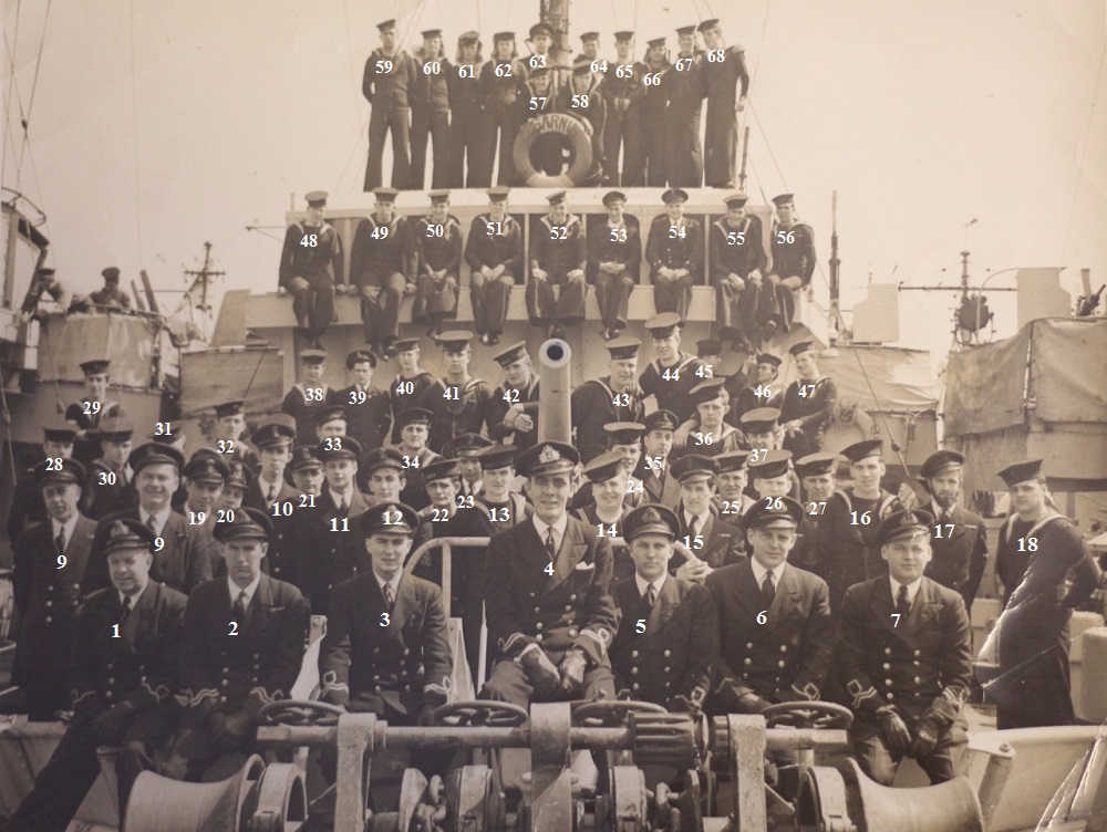 (1) Salter, Lt Albert (Pat), E.O. (2) Kirby, Lt Doug, ASDIC Officer (3) Shonfield, Morris, X.O. (4) Douty, Lt Robert (Bob), C.O. (5) Brown, SLt Bill, NavO (6) Howard, SLt Louis (Lou), (7) Cantril, Lt John (Jack), Signals Officer (11) Martin, Louis (13) Ahern, Maurice Francis (15) McDougall, Leo (17) Finkbeiner, Howard, SBA (36) Marsh, Gordon H. (43) Burch, Robert Charles
