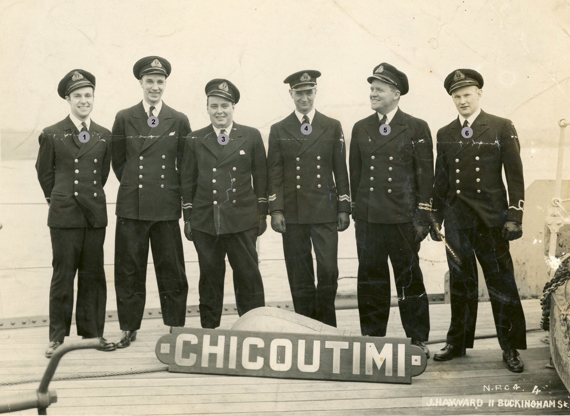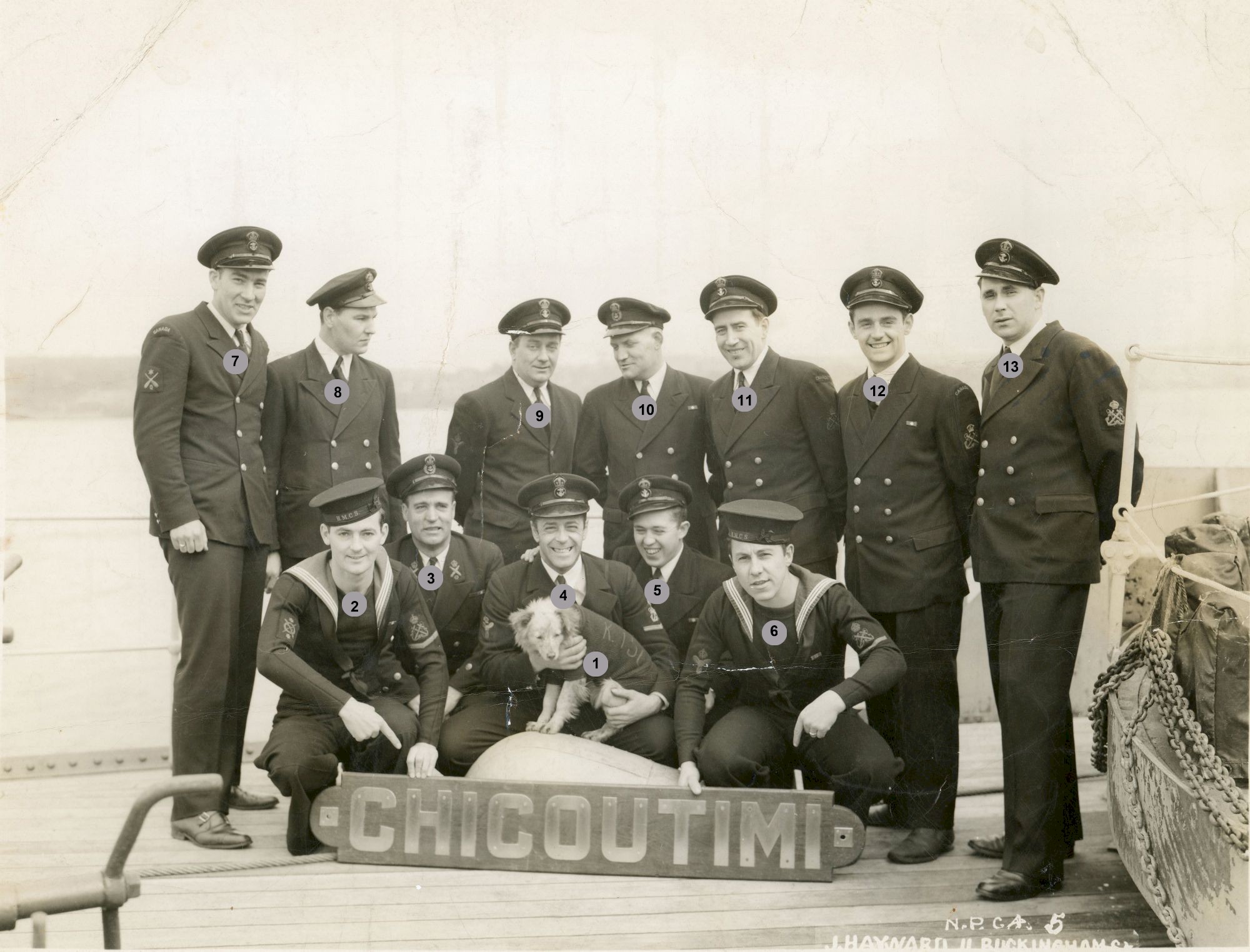 HMCS CHICOUTIMI K156 Officers - undated Click on the above photo to view a larger image Click here to view the photo with crew numbered for identification purposes From the collection of Roy Goforth, Acting Leading Stoker, RCNVR Courtesy of Kevin Goforth