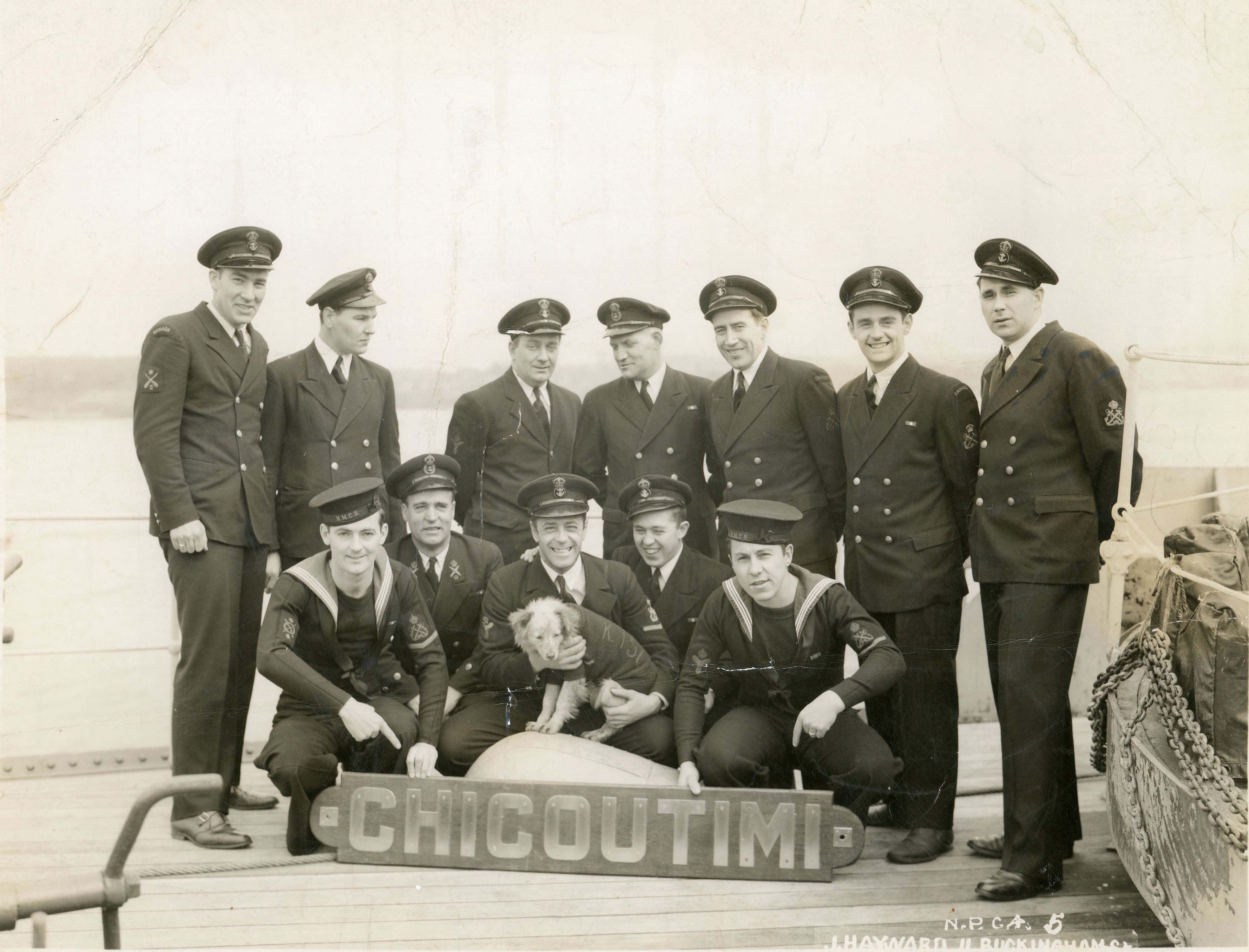 Stokers and the ship's mascot on HMCS CHICOUTIMI K156 Courtesy of the Naval Museum of Halifax