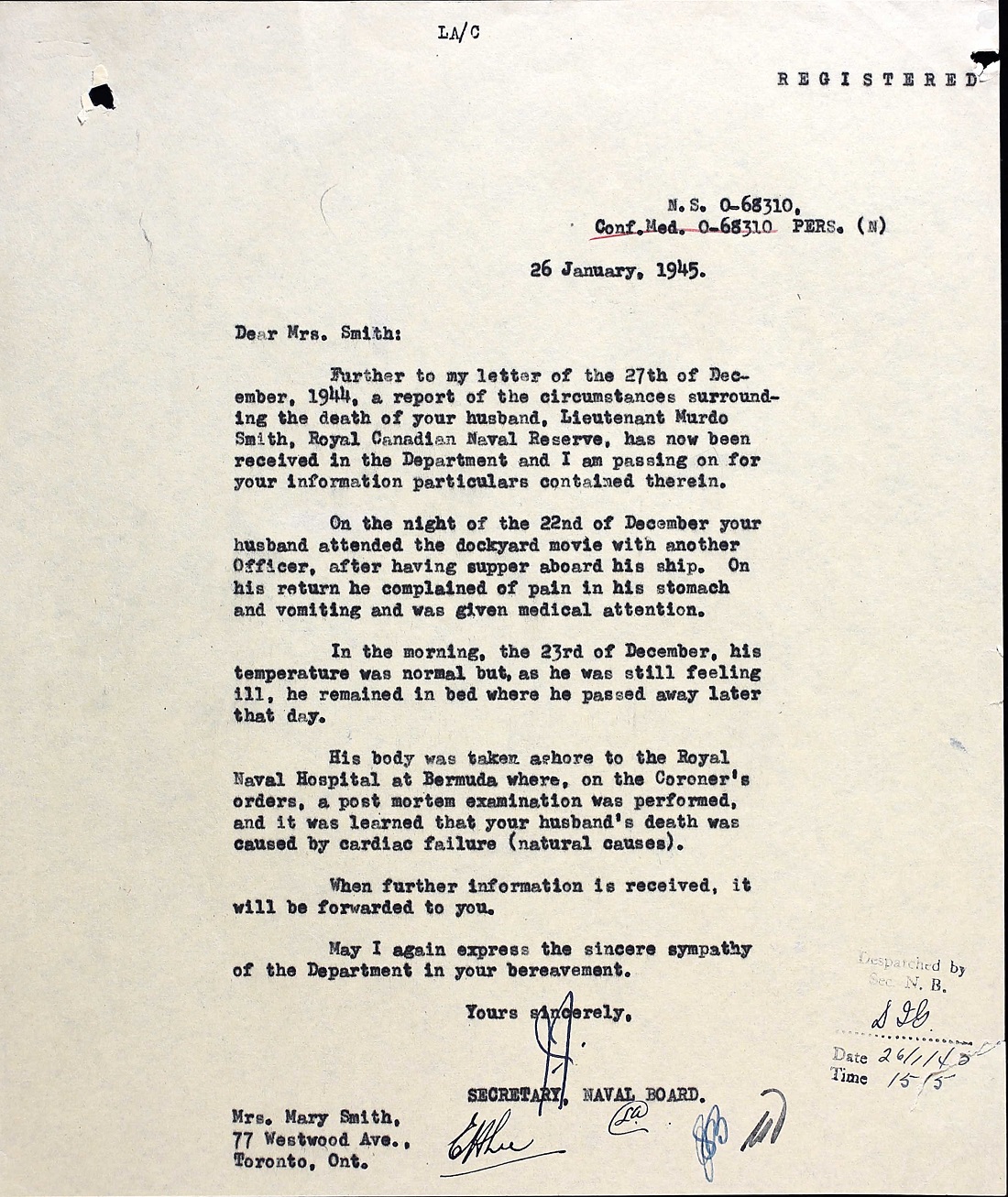 Lt Smith died of cardiac arrest at Bermuda on 23 Dec 1944. He was Commanding Officer of HMCS West York at the time of his death.