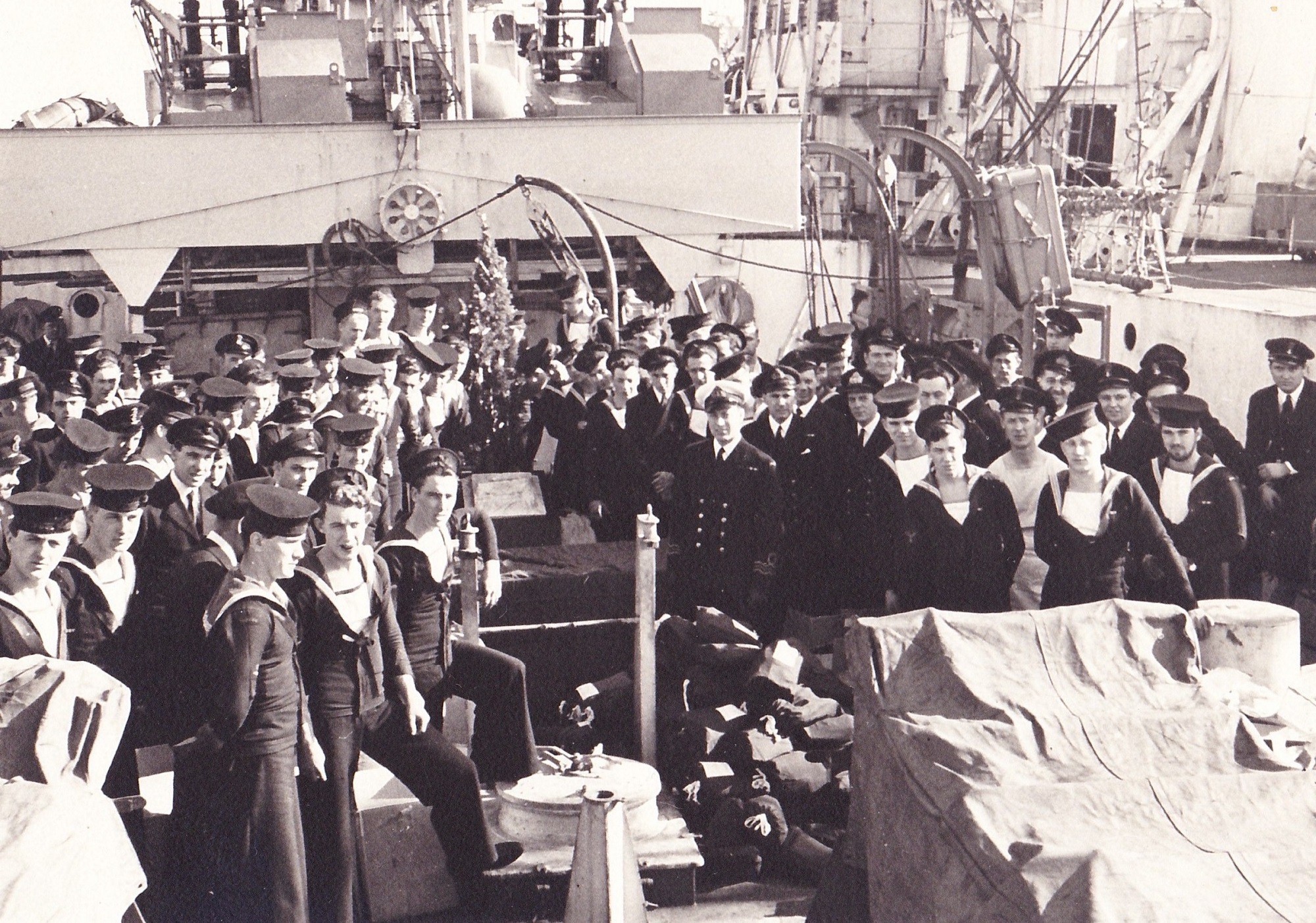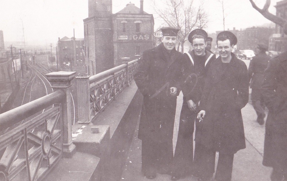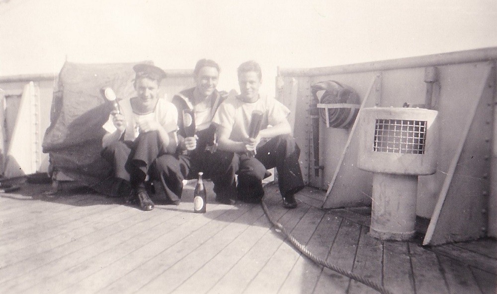 (HBS015) Unknown sailors drinking champagne by the break-water on HMCS WINNIPEG J337 (HBS016) Hamilton Skilling on HMCS WINNIPEG J337 (HBS017) Christmas on HMCS WINNIPEG J337 - year unknown // Note the Christmas tree in behind the sailors and all the gifts on the deck just behind the depth charge rack. (HBS018) Port visit New York, HMCS WINNIPEG J337 // Hamilton Skilling (centre) and shipmates on Staten Island, NY, 1943 (HBS019) Sailor on the fo'c's'le of HMCS WINNIPEG J337 chipping ice