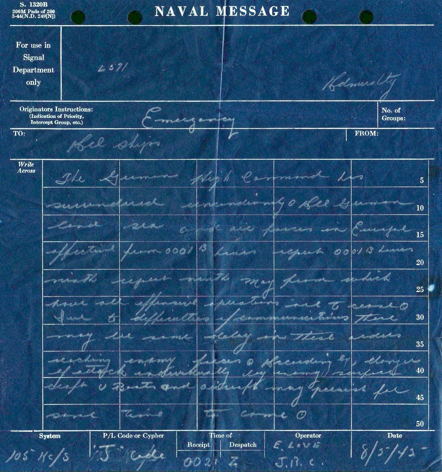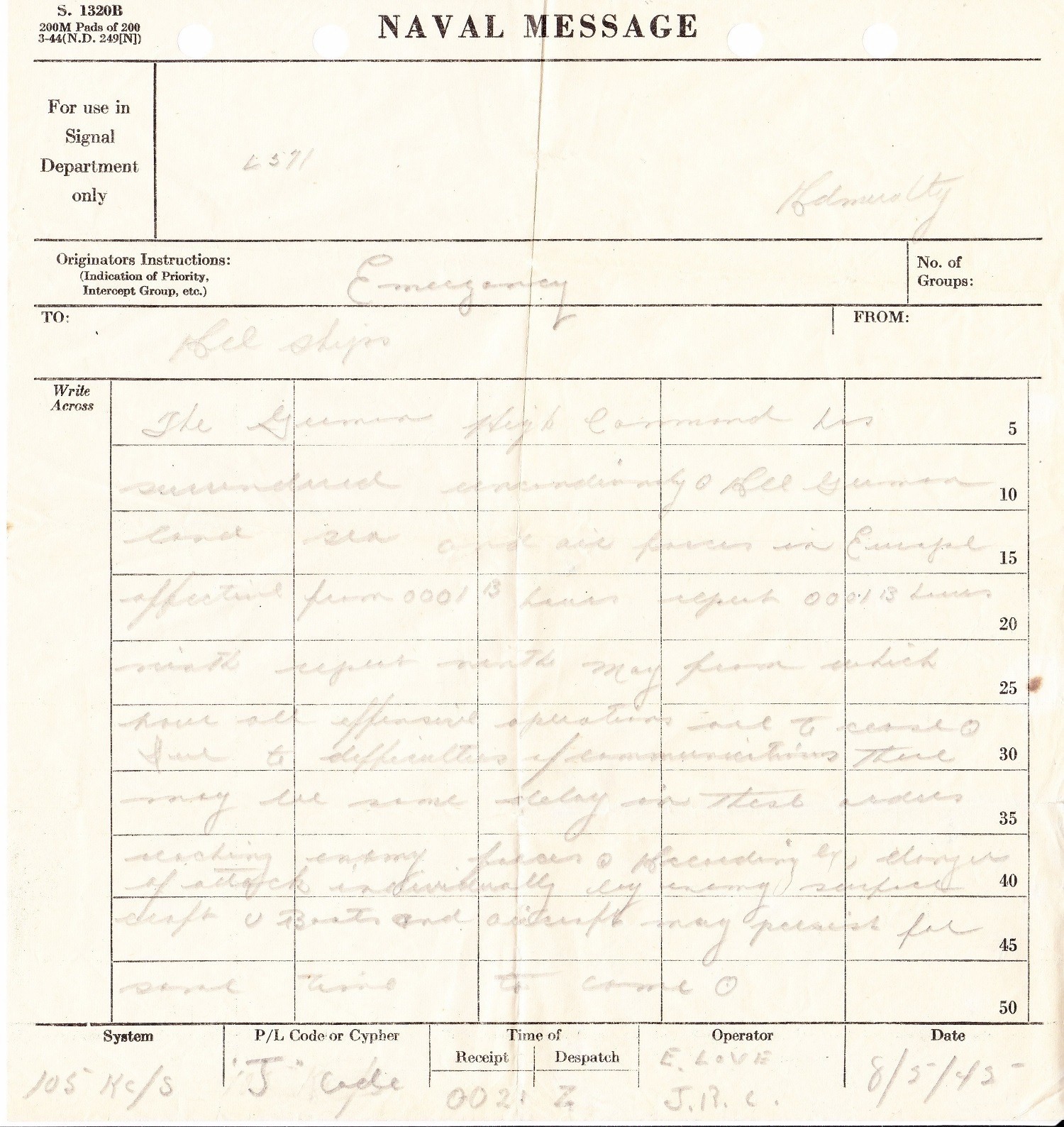 (HBS026) The War is Over - Message received by the radiomen on HMCS WINNIPEG saying the German High Command has surrendered unconditionally. Hamilton Skilling was a Submarine Detector on HMCS WINNIPEG J337, but he managed to get a copy of this message and save it. The lower image is the message converted to a negative to help in reading the written text. One of the operators who received the message was "E. Love".