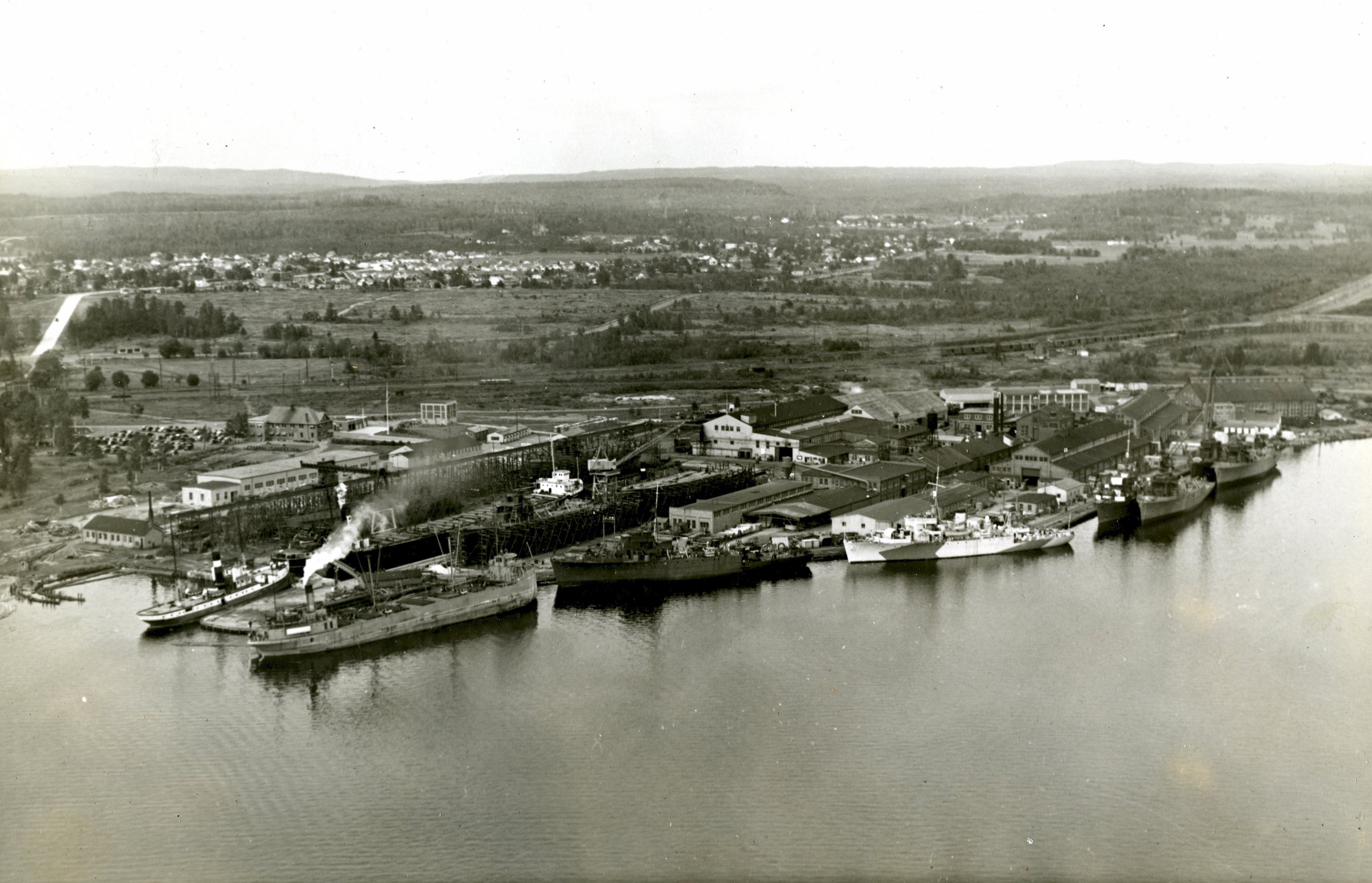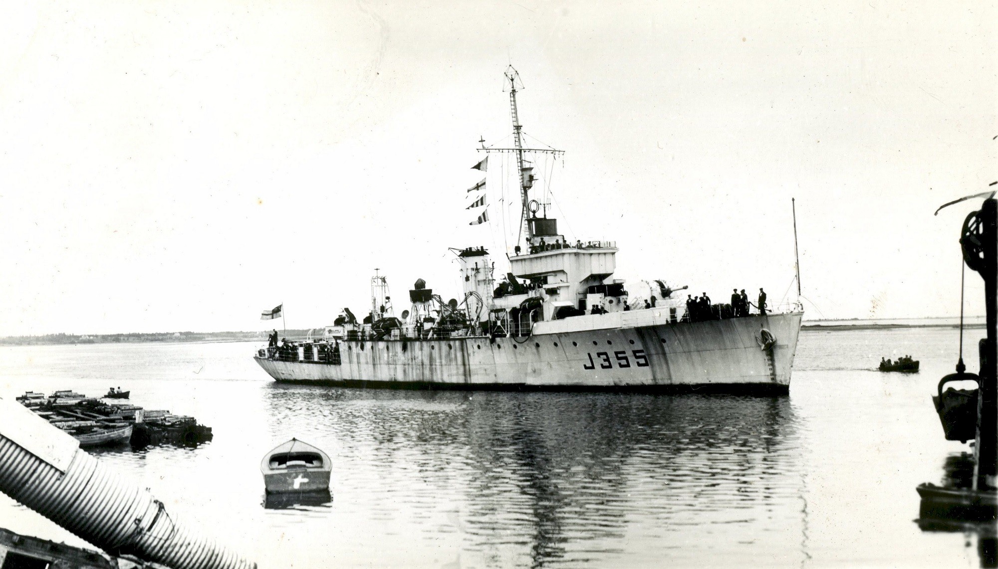 (JEH040) Newspaper article on the upcoming port visit of HMCS ROCKCLIFFE J355 and HMCS OSHAWA J330 at Bathurst, NB on 01 Jul 1945 (JEH041 - JEH044) HMCS ROCKCLIFFE J355 (in company with HMCS OSHAWA J330) arriving at Bathurst, NB, 01 Jul 1945