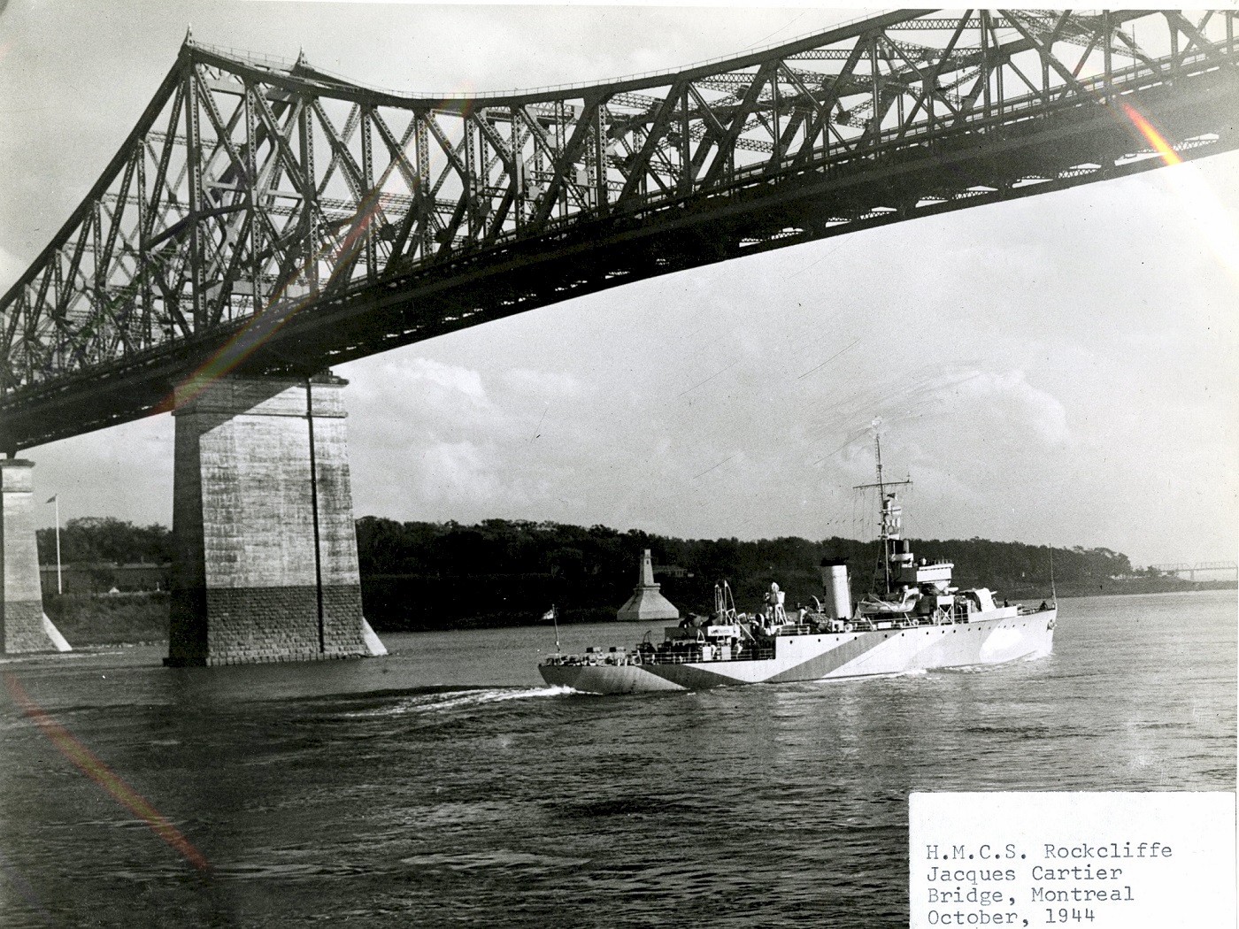 (JEH016) HMCS ROCKCLIFFE J355fitting out at Port Arthur, ON - Sep 1944 (JEG017) HMCS ROCKCLIFFE J355 transiting the St. Lawrence, passing Montreal, enroute to Halifax - Oct 1944. Note that her radar antenna has been removed by the censors (JEH018) HMCS ROCKCLIFFE J355 transiting the St. Lawrence, passing under the Jacques Cartier bridge, Montreal, enroute to Halifax - Oct 1944 (JEH019) Gun mount and bridge of HMCS ROCKCLIFFE J355 (JEH020) HMCS ROCKCLIFFE J355 conducting a stern fueling