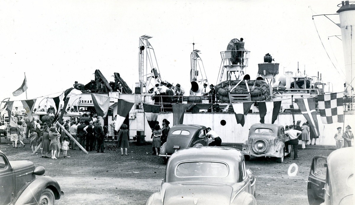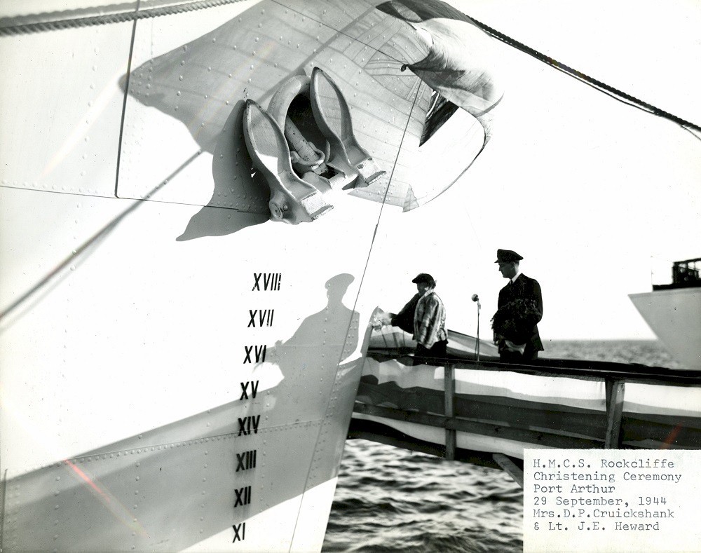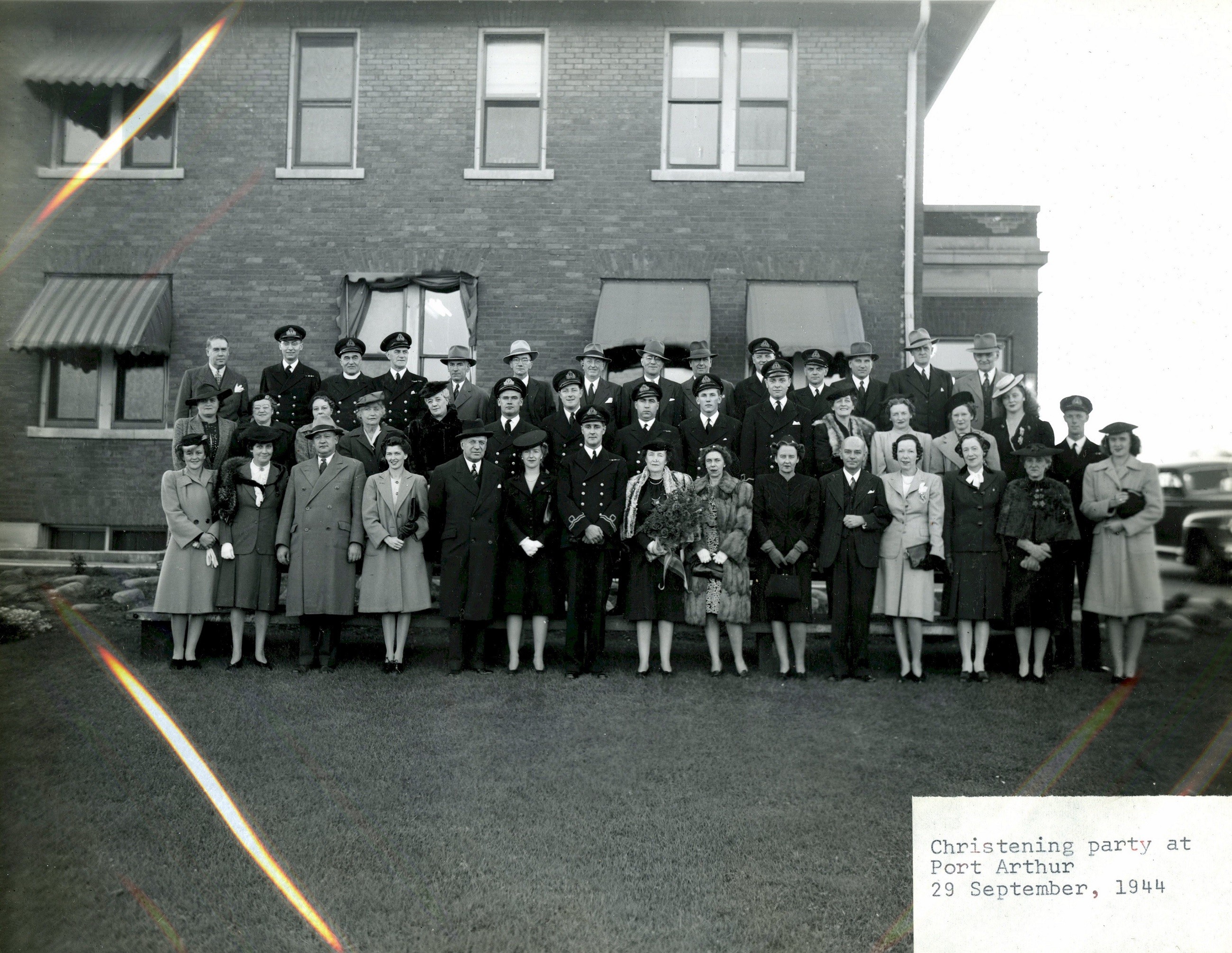 The Christening of HMCS ROCKCLIFFE J355, Port Arthur, ON, 29 Sep 1944 (JEH013 - JEH014) Mrs. D. P. Cruickshank and Lt. J. E. Heward (JEG015) The Christening Party