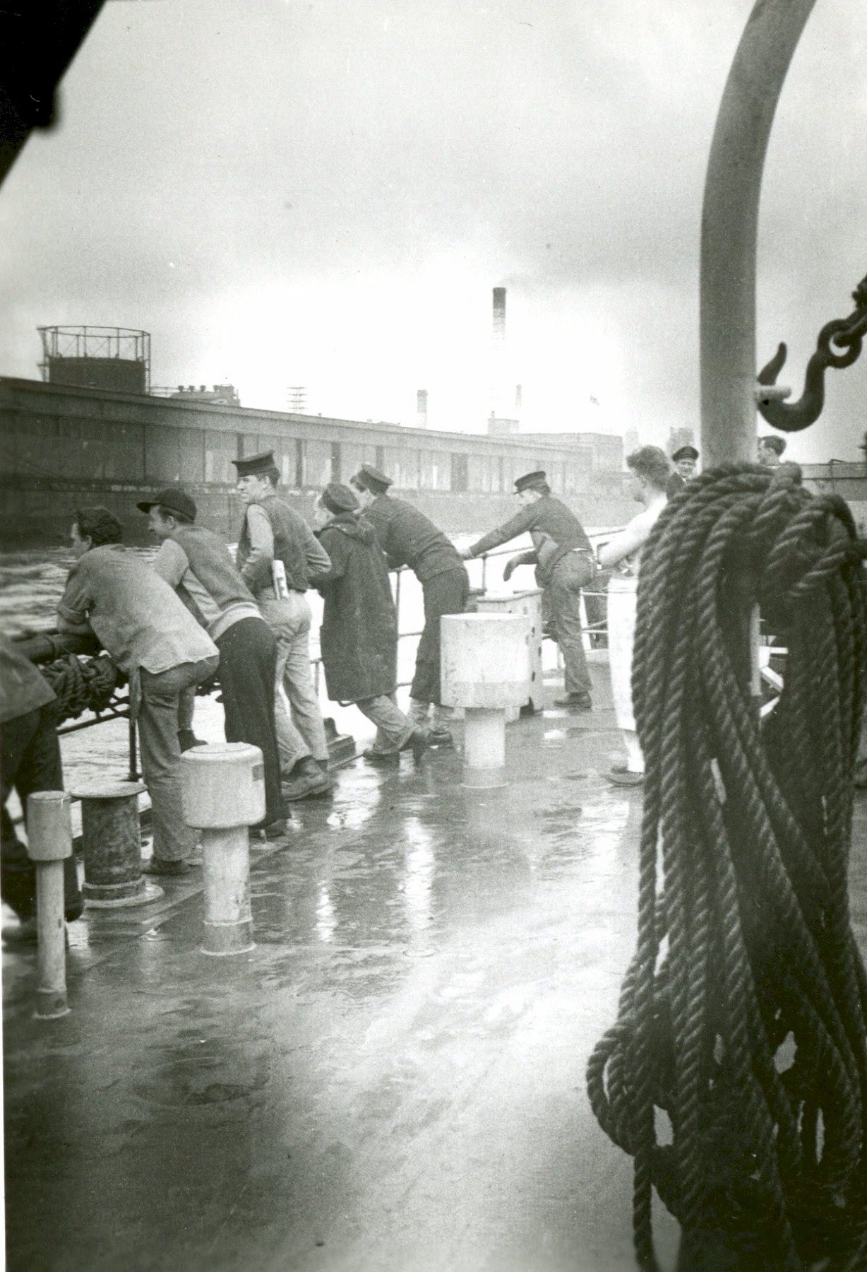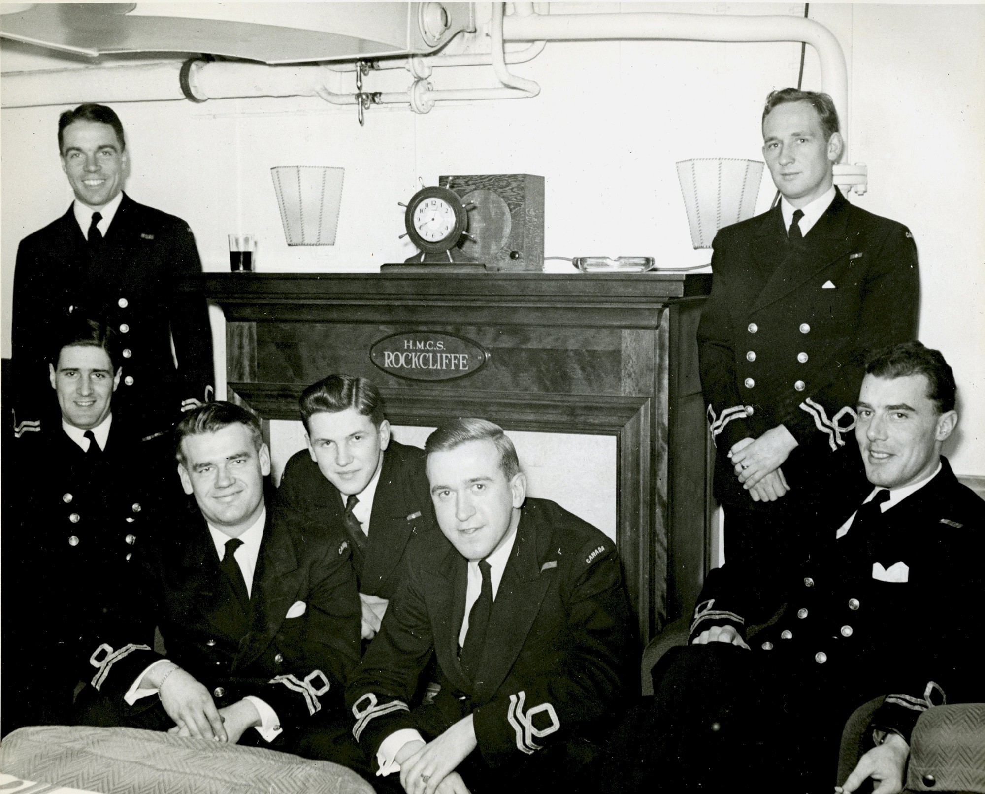 (JEH031) SLt George Best on the bridge of HMCS ROCKCLIFFE J355 - circa 1945 (JEH032) Officers in the wardroom of HMCS ROCKCLIFFE J355 - early 1945. Lt Raymond M. Hall - Top right (JEH033) Sailors along the rails as HMCS ROCKCLIFFE J355 pulls away from the jetty in Halifax - date unknown (JEH034) Boat crew from HMCS ROCKCLIFFE J355 being lowered - date unknown (JEH035) HMCS ROCKCLIFFE J355 moored to a buoy at Bermuda- date unknown