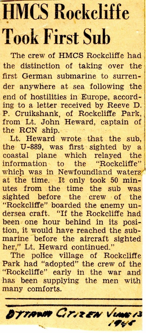 (JEH036) HMCS ROCKCLIFFE J355, V.E. Day in Halifax (JEH037) Lt. John E. Heward, HMCS ROCKCLIFFE; Lt. Bob Hunter, HMCS DUNVEGAN; LCdr Richard (Dick) Williams, HMCS SASKATOON; LCdr Jim Pratt HMCS OSHAWA (OTC), on board U 889 in Halifax May 1945 (JEH038) Newspaper article on the surrender of U-889 to HMCS ROCKCLIFFE J355 // The Ottawa Citizen 13 Jun 1945 (JEH039) Crews from ROCKCLIFFE and OSHAWA on their respective quarterdecks - date and place unknown