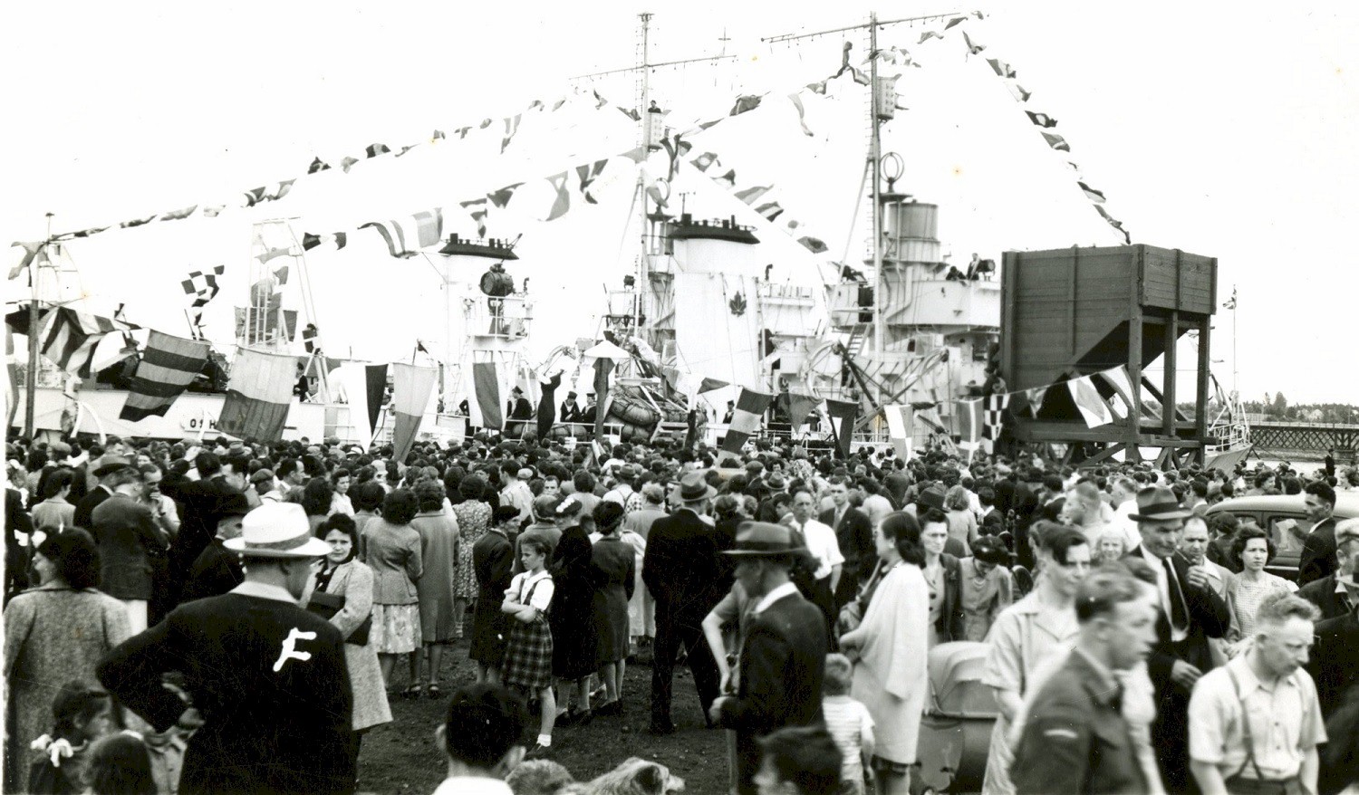 (JEH048) LCdr Richard (Dick) Sugden Williams (C.O. of HMCS OSHAWA) meets Betty and Peter Heward (wife and son of John Heward - C.O of HMCS ROCKCLIFFE) onboard HMCS OSHAWA (JEH049 - JEH052) HMCS OSHAWA J330 (inboard) and HMCS ROCKCLIFFE J355 (outboard) at Bathurst, NB, Jul 1945 Note: The port visit to Bathurst, NB was not originally in the deployment schedule. Heward apparently work hard to get the town added to the list. His family summer home was there and he wanted to be able to see his wife and son.