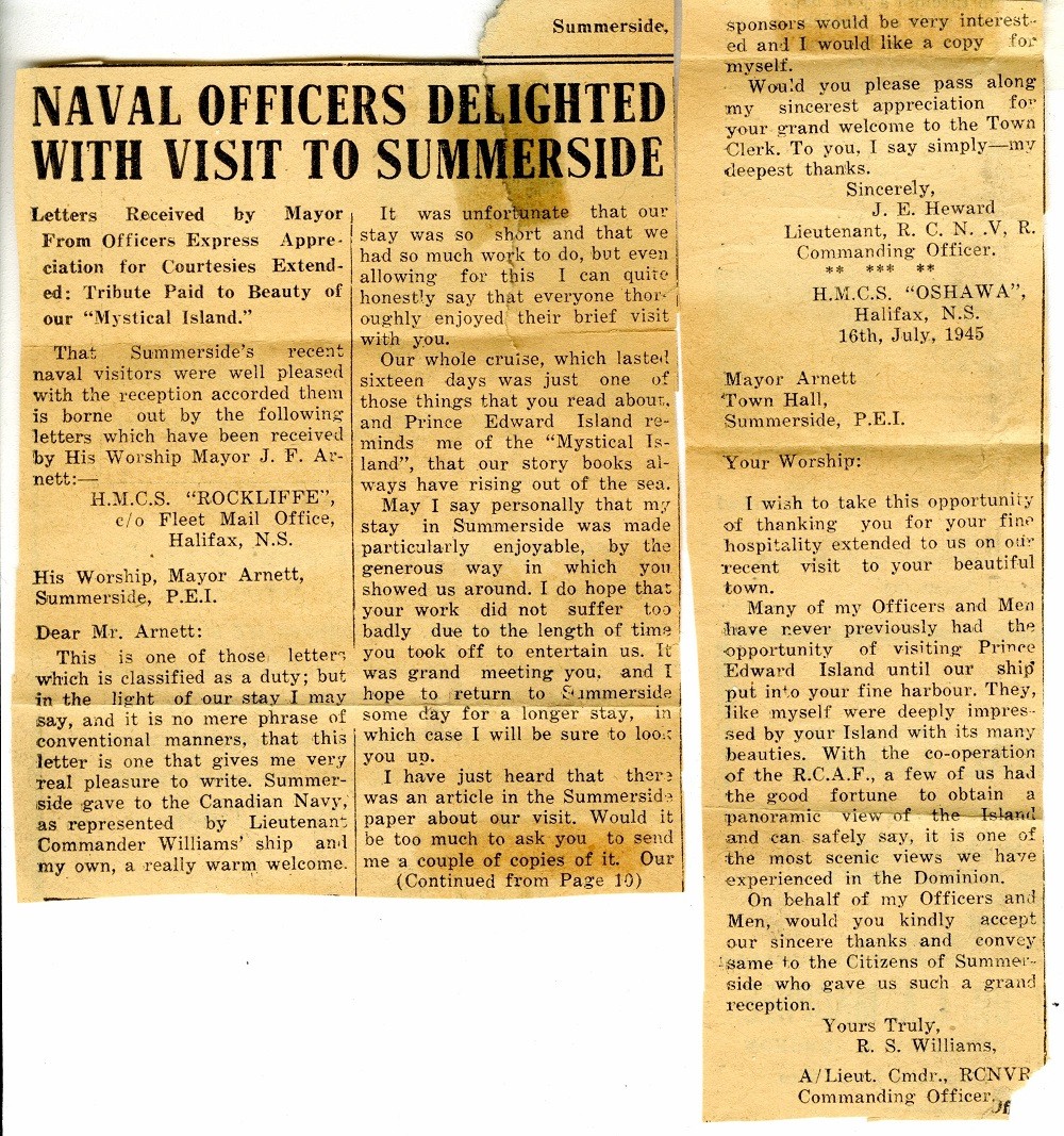 (JEH056) Newspaper article on the visit of HMCS ROCKCLIFFE J355 and HMCS OSHAWA J330 to Summerside, PEI
