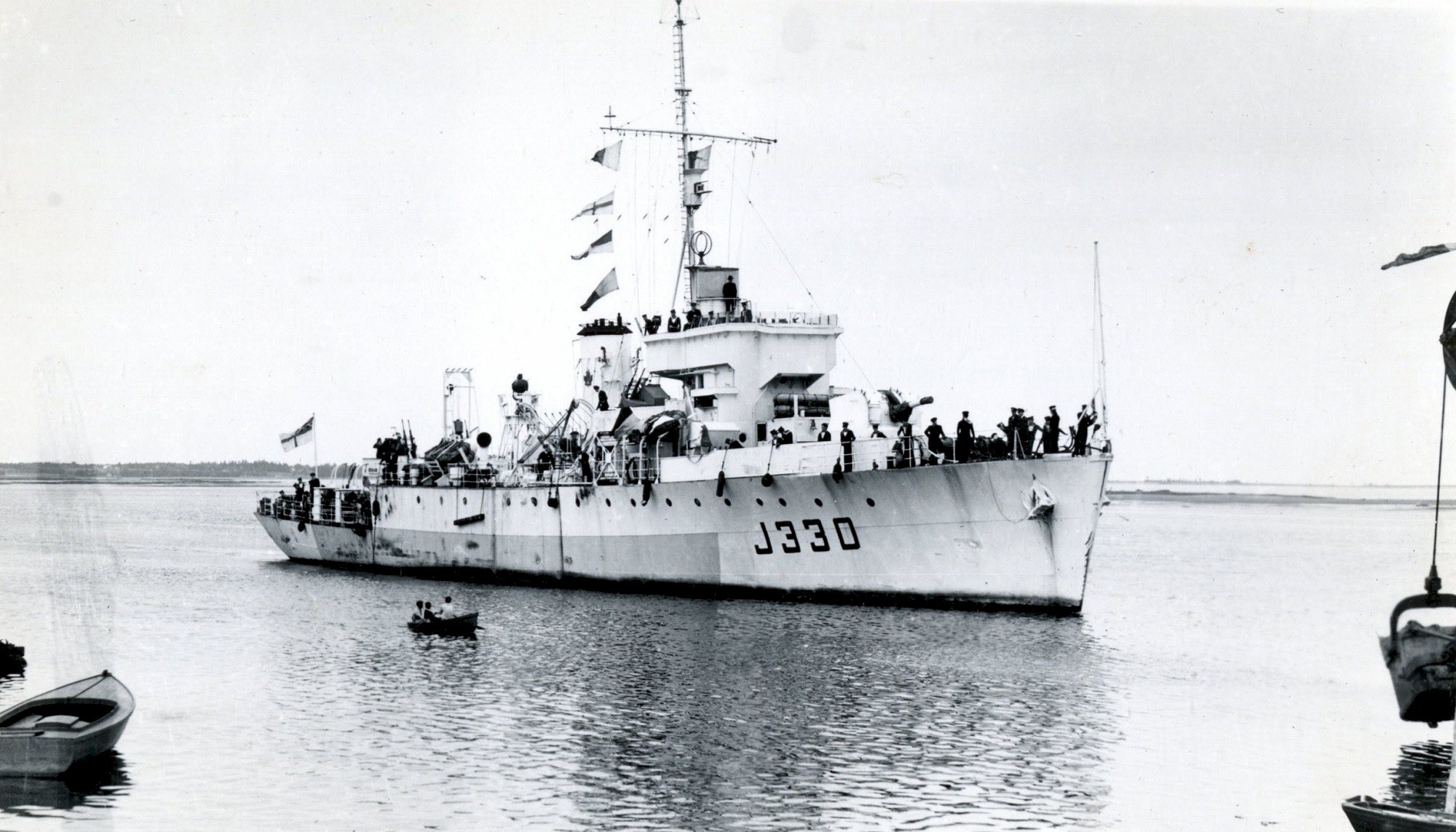 (JEH0045 - JEH047) HMCS OSHAWA J330 (in company with HMCS Rockcliffe J355) arriving at Bathurst, NB, 01 Jul 1945