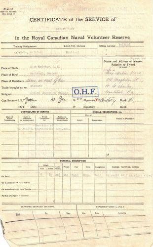 Ships served in: MONTREAL DIVISION RCNVR - Enlisted 13 Jan 1941 * Commenced Active Service 08 May 1941 as an Ordinary Seaman, RCNVR HMCS STADACONA - Drafted to STADACONA 19 Jun 1941 HMC SIGNAL SCHOOL - Drafted to HMC SIGNAL SCHOOL 01 Jul 1941 HMCS ST HYACINTHE - Drafted to ST HYACINTHE 01 Oct 1941 * Transferred to Seaman Branch as an Ordinary Seaman, RCNVR 11 Nov 1941 HMCS STADACONA - Drafted to STADACONA 19 Nov 1941 HMS PARRSBORO - Drafted to PARRSBORO 20 Feb 1942. PARRSBORO was a Royal Navy Bangor Class Minesweeper. HMCS CANSO - Drafted to CANSO 04 Mar 1942 * Rated Acting Able Seaman, RCNVR 08 May 1943 HMCS NADEN - Drafted to NADEN 12 May 1942 HMCS STADACONA - Drafted to STADACONA 13 May 1942 HMCS NIOBE - Drafted to NIOBE 02 Jun 1942 HMCS LOUISBURG - Drafted to LOUISBURG 02 Dec 1942 * Survived the sinking of HMCS LOUISBURG on 06 Feb 1943 HMCS NIOBE - Drafted to NIOBE 07 Feb 1943 HMCS STADACONA - Drafted to STADACONA 19 Mar 1943 HMCS CORNWALLIS - Drafted to CORNWALLIS 20 May 1943 HMCS STADACONA - Drafted to STADACONA 01 Jun 1943 HMCS HAMILTON - Drafted to HAMILTON 09 Jul 1943 * Rated Provisional Leading Seaman, RCNVR 15 Sep 1943 * Rated Acting Leaving Seaman, RCNVR 01 Nov 1943 HMCS CORNWALLIS - Drafted to CORNWALLIS 18 Apr 1944 HMCS STADACONA - Drafted to STADACONA 19 Apr 1944 HMCS PROTECTOR - Drafted to PROTECTOR 26 Apr 1944 HMCS GLENLEA - Drafted to GLENDA 29 Aug 1944 * Rated Acting Petty Officer, RCNVR 15 Sep 1944 HMCS PROTECTOR - Drafted to PROTECTOR 29 Sep 1944 HMCS AVALON - Drafted to AVALON 20 Feb 1945 HMCS NORTH SHORE - Drafted to NORTH SHORE 02 Apr 1945 HMCS AVALON - Drafted to AVALON 11 Apr 1945 HMCS SEA CLIFF - Drafted to SEA CLIFF 27 Apr 1945 HMCS PEREGRINE - Drafted to PEREGRINE 20 Jun 1945 HMCS DONNACONA - Drafted to DONNACONA 25 Jun 1945 * Demobilized 26 Jul 1945 as an Acting Petty Officer, RCNVR