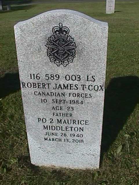 Headstone of P2ER Maurice Middleton and his son, LS Robert Cox in the Fort Massey Cemetery, Halifax, NS