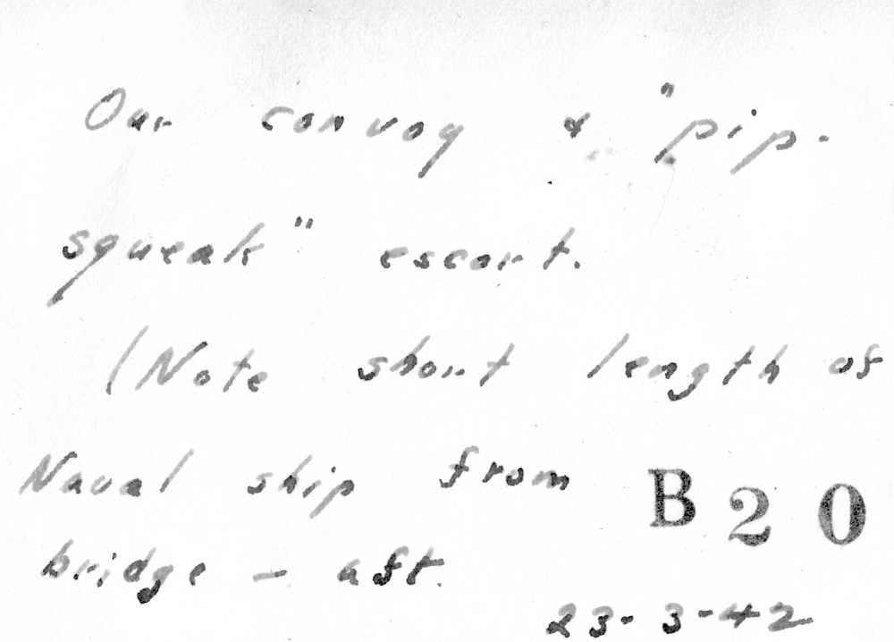 (PS01) SLt Barry Brissenden, Victoria, BC on HMCS MALPEQUE (PS02) back of PS01 (PS03) "Our convoy and "pip squeak" escort. (Note short length of naval ship from bridge-aft) - 23 Mar 1942 (PS04) back of PS03