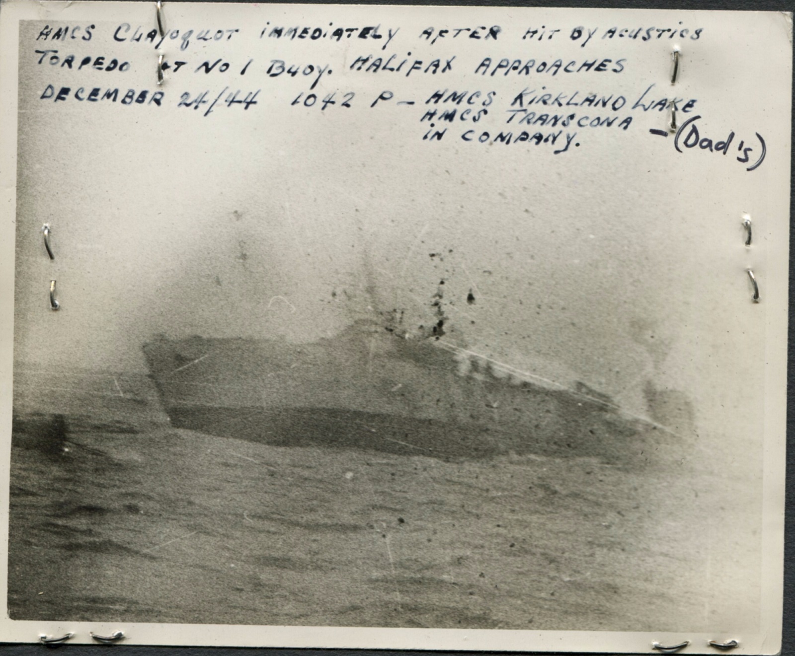 (WM25-WM27) HMCS CLAYOQUOT - Immediately after being hit by acoustics torpedo at No. 1 Buoy, Halifax Approaches, 24 Dec 1944, 1042 P. Ships in Company - HMCS KIRLAND LAKE, HMCS TRANSCONA
