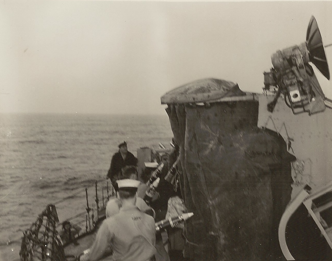 Note: These photos were sent to LCdr John Quinn's widow by then Cdr William (Bill) Landymore after LCdr Quinn died on 02 Oct 1952. It is possible that some of the gun crew in the photos are those that were either killed or injured that day off the Korean penninsula.