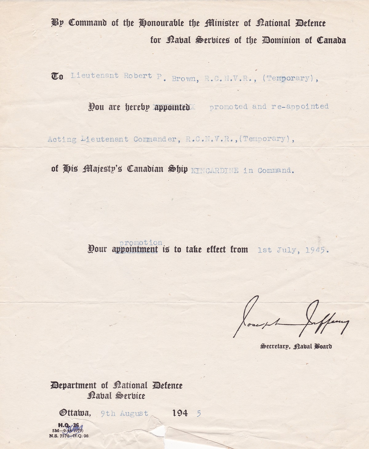(RB01) Portrait of Lt Robert Brown (RB02) Lt Robert Brown on the bridge of HMCS KINCARDINE (RB03-RB04) Lt Robert Brown's Watch-Keeping Certificate for HMCS SNOWBERRY with cover letter - issued 10 Aug 1942 (RB05) Robert's promotion to A/LCdr effective 01 Jul 1945