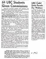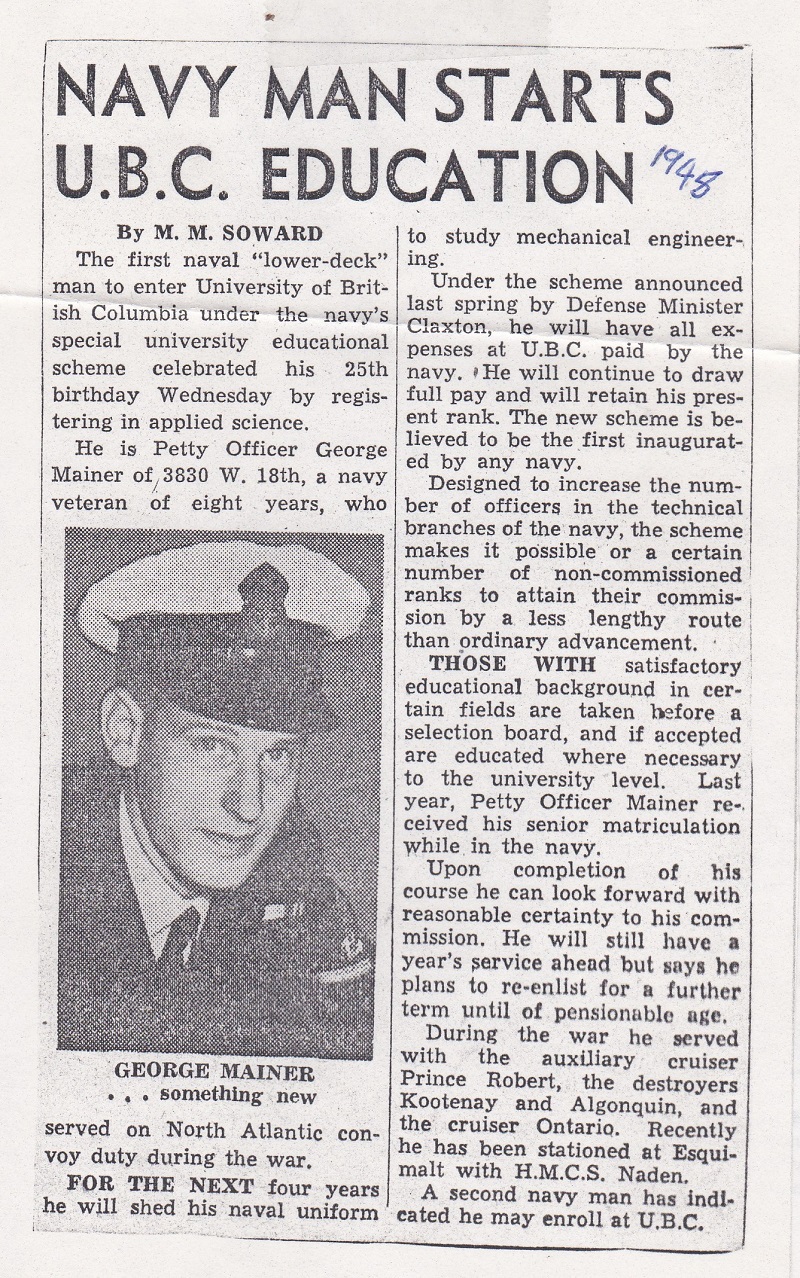 Newspaper articles on George Mainer attending and graduating from University of British Columbia under the RCN's new University Educational plan.