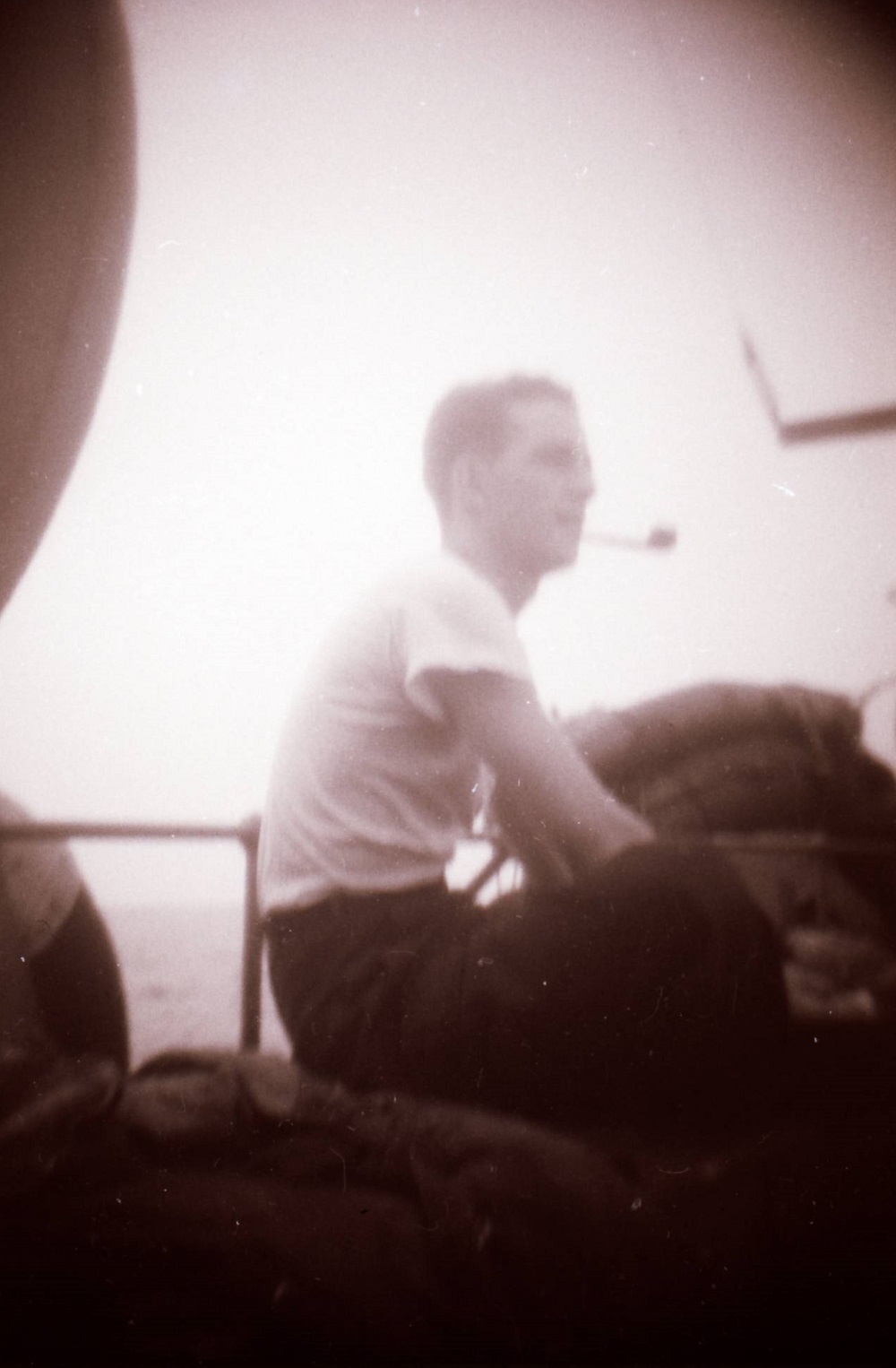 (DB41) Des Bolin on HMCS SASKATOON K158 (DB42) Des Bolin by the pom-pom mount on HMCS SASKATOON K158 - note this is a double exposed photo) (DB43) Double exposed photo rotated showing sailors sitting just aft the funnel on HMCS SASKATOON K158 (DB44) Unknown sailors on HMCS SASKATOON K158. The sailor combing his hair and the one with the book appears to be the same sailors in the rotated double exposed photo (DB45) Signal flags flying on HMCS SASKATOON K158