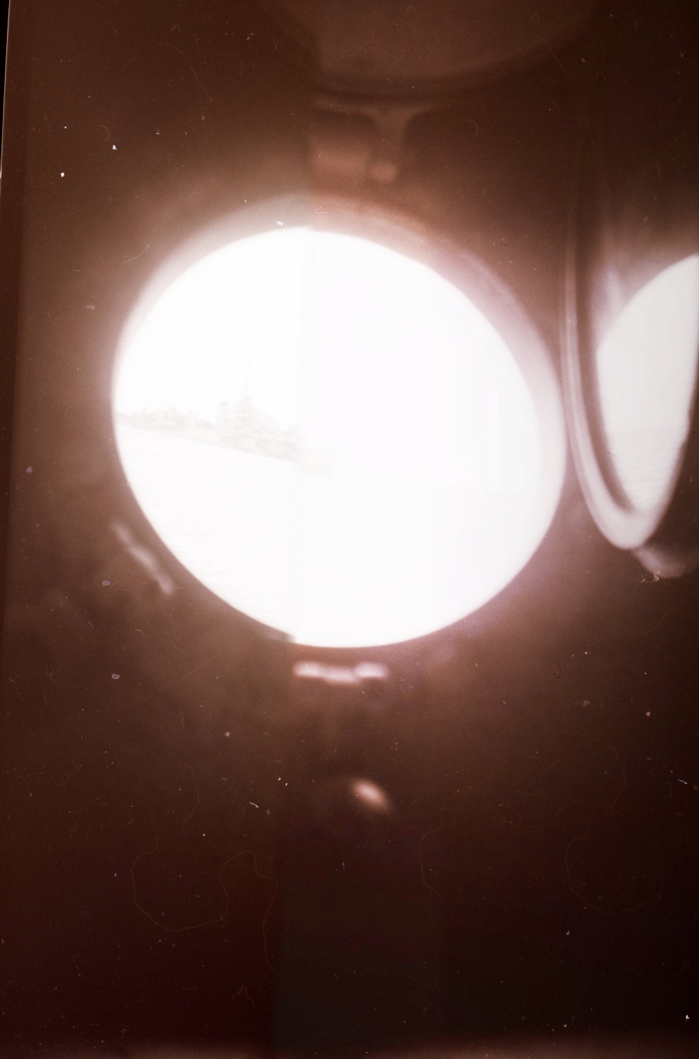 (DB78) Faint image of a ship visible through the porthole on HMCS SASKATOON K158 (DB79) Looking up at signal flags from between the mast and funnel on HMCS SASKATOON K158 (DB80) Unknown sailor in a mess deck on HMCS SASKATOON K158