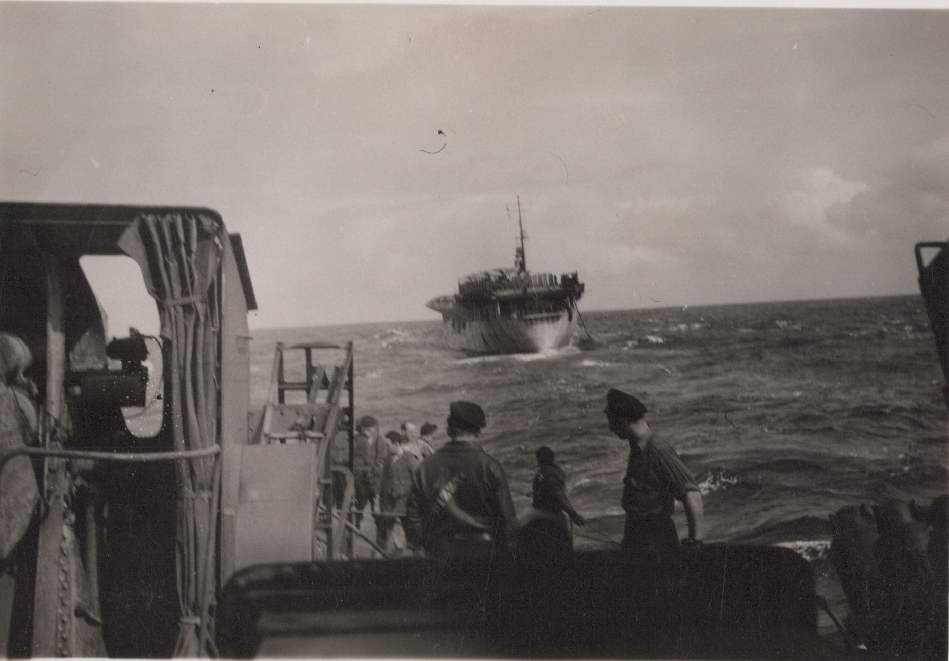 HMCS COBOURG conducting a stern fueling with a Merchant Aircraft Carrier (MAC) (AB15) The heaving line which is attached to the fueling hose from the MAC is being winched in on HMCS COBOURG (AB16-AB19) HMCS COBOURG K333 fueling from the MAC