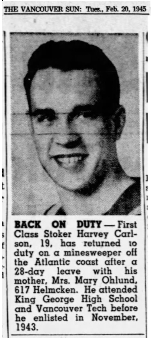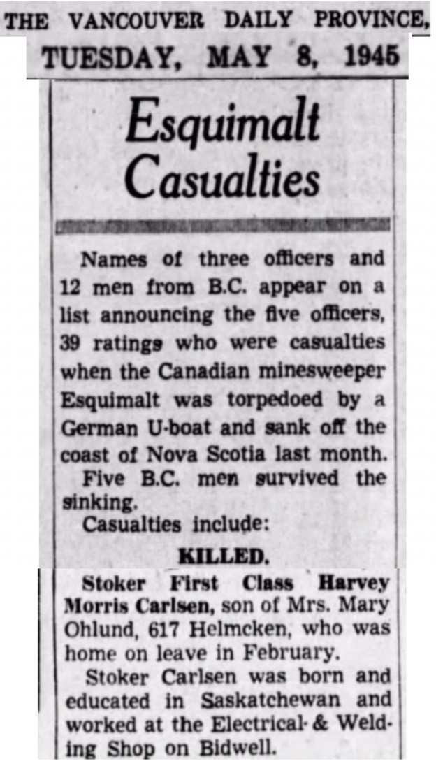 (HC04) Article on the death of Stoker Harvey Carlsen (HC05) Obituary for Stoker 1c Harvey Carlsen (HC06) Part of an article on HMCS ESQUIMALT casualties which lists Stoker Harvey Carlsen (HC07) In memory of Walter Carlsen and his brother Stoker Harvey Carlsen (HC08) In memory of Stoker Harvey Carlsen