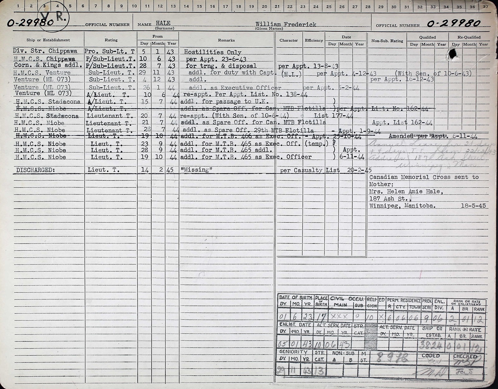 Ships served in: HMCS CHIPPAWA - Enlisted 05 Jan 1943 as a Prob. SLt, RCNVR. HMCS CHIPPAWA - Commenced Active Service 10 Jun 1943 HMCS CORNWALLIS & HMCS KINGS - Appointed 28 Jul 1943 for Training and Disposal HMCS VENTURE - Appointed to VENTURE 29 Nov 1943, add'l for duty with Captain M.L. as a SLt, RCNVR ML Q073 - Appointed to Q73 04 Dec 1943 as a SLt, RCNVR. Re-Appointed to Q073 VENTURE 26 Jan 1944 as a SLt, RCNVR, XO. Re-Appointed to Q073 10 Jun 1944 as an A/Lt, RCNVR HMCS STADACONA - Appointed to STADACONA 15 Jul 1944, add'l for passage to UK as an A/ Lt, RCNVR. Re-Appointed at a Lt, RCNVR (seniority 10 Jun 1944) HMCS NIOBE - Appointed to NIOBE 21 Jul 1944, add'l as Spare Officer for Canadian MTB Flotilla as a Lt, RCNVR HMCS NIOBE - Appointed to NIOBE 28 Jul 1944, add'l as Spare Officer 29th MTB Flotilla as a Lt, RCNVR MTB-465 - Appointed to MTB-465 23 Sep 1944 as a Lt, RCNVR, XO. Appointed to MTB-465, add'l 28 Sep 1945 as a Lt, RCNVR MTB-466 - Appointed to MTB-466 19 Oct 1944 as a Lt, RCNVR, XO
