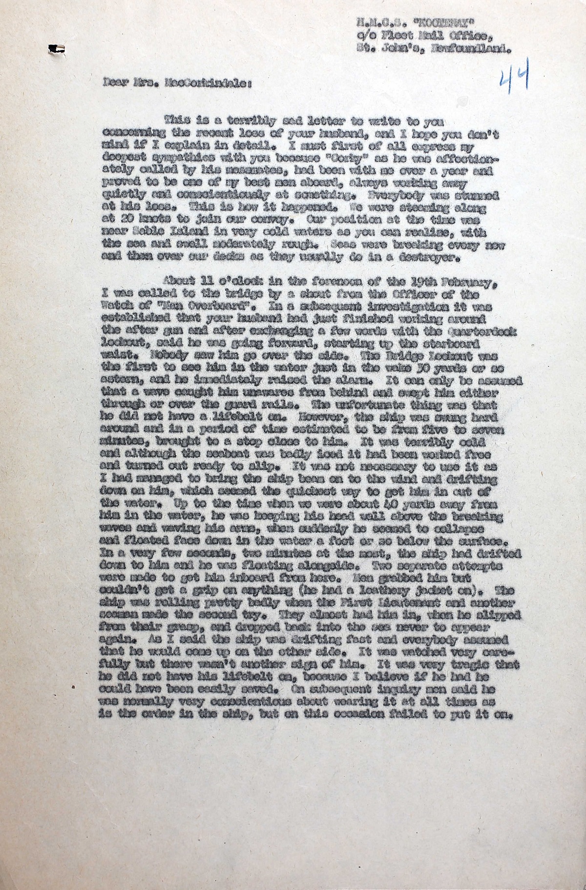 (RM06) Report of Death (RM07) C.O.'s report on the death of OA MacCorkindale (RM08-RM09) Letter to OA Robert MacCorkindale's widow