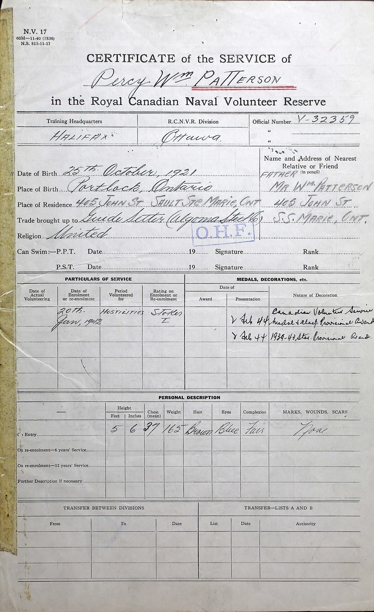 Ships served in: HMCS CARLETON - Enlisted / Commenced Active Service 20 Jan 1942. HMCS YORK - Served in York 26 Jan 1942 - 23 Mar 1942 as a Sto 1c, RCNVR HMCS MOOSE JAW - Served in MOOSE JAW 28 May 1942 - 13 Sep 1942 as a Sto 1c, RCNVR HMCS RED DEER - Served in RED DEER 20 Sep 1942 - 28 Oct 1943 as a Sto 1c, RCNVR HMCS HALIFAX - Served in HALIFAX 18 Apr 1944 - 19 Jul 1944 as an A/L/Sto, RCNVR HMCS AVALON II - Served in AVALON II 05 Aug 1944 - 10 Sep 1944 as an A/L/Sto, RCNVR HMCS DUNVER - Drafted to DUNVER 26 Oct 1944
