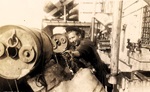 (AW14) Haircut time - Unknown sailors on HMCS FENNEL K194 (AW15) Unknown sailors on HMCS FENNEL K194 (AW16) Unknown officer on HMCS FENNEL K194. Note the layer of ice coating the ship (AW17) Unknown officer playing a guitar on the bridge of HMCS FENNEL K194 (AW18) Unknown sailors playing a guitar and harmonica on HMCS FENNEL K194