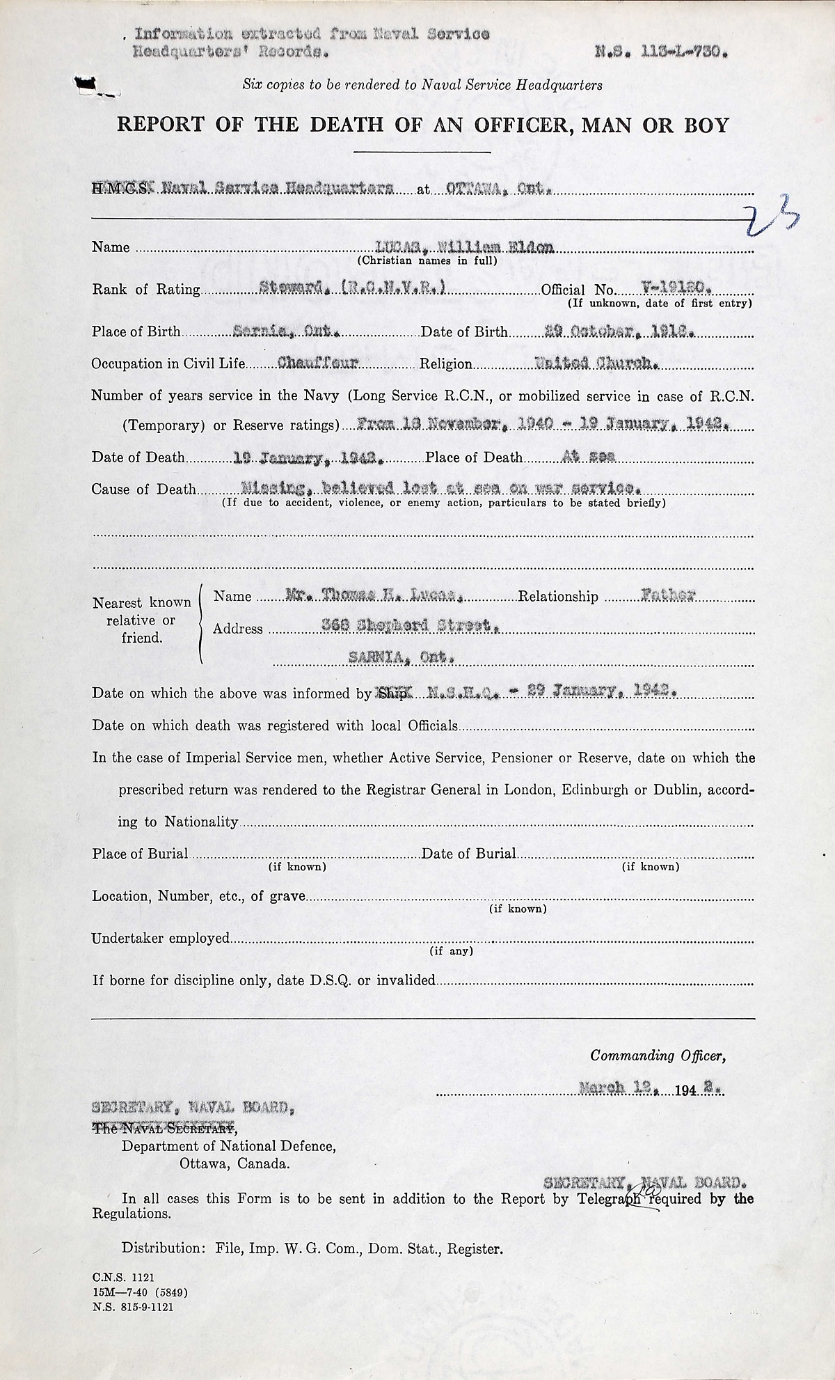 LUCAS, William Eldon, OS, Stwd, V19180, RCNVR, MPK - 19 Jan 1942, HMCS VISON / RMS LADY HAWKINS - Son of Thomas Henry and Lily May Lucas, of Sarnia, ON.