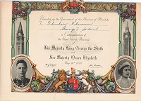 (TT00) Certificate commemorating the Coronation of King George VI in 1937 given to Ted Thomson while he was attending George V School in Winnipeg (TT01) Certificate commemorating the visit of King George V and Queen Elizabeth to Winnipeg in 1939 given to Ted Thomson while he was attending George V School in Winnipeg