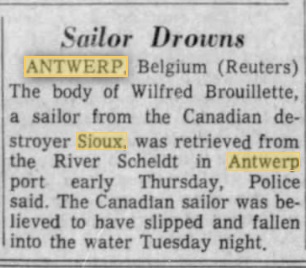 AB Brouillette died when he fell from HMCS SIOUX into the River Scheldt in Antwerp, Belgium sometime during then night of 1/2 Dec 1959. He was buried in the Choloy War Cemetery, Meurthe-et-Moselle, France.