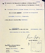 Ships served in: HMCS YORK - Enlisted 16 Oct 1942. Commenced Active Service 01 Jul 1943 HMCS CORNWALLIS - Appointed to CORNWALLIS 08 Sep 1943 as a Prob. SLt, RCNVR HMCS KINGS - Appointed to KINGS 17 Jan 1944 as a Prob. SLt, RCNVR HMCS TRENTONIAN - Appointed to TRENTONIAN 17 Jul 1944 as SLt, RCNVR. Appointed A/Lt 01 Jul 1944. Appointed Lt 13 Dec 1944.