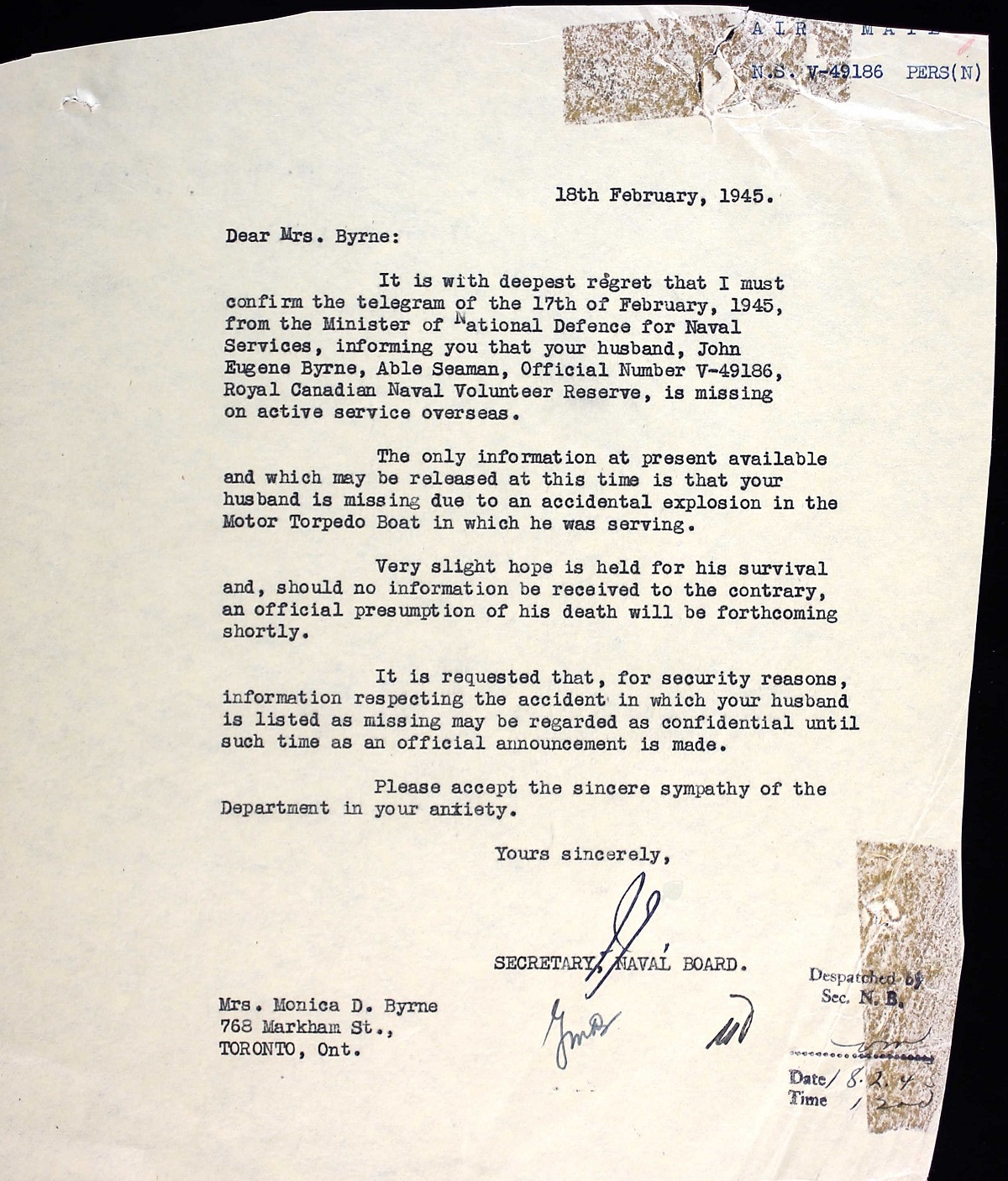 Able Seaman, Jack Eugene Byrne, 22 R.C.N.V.R., has been missing and presumed dead since Feb. 14, after an accidental explosion in Belgium, according to word received by his wife, the former Monica Irish, 768 Markham St. Born in Toronto, Able Seaman Byrne was educated at St. Mary's and Corpus Christi separate schools and De La Salle Collegiate. Enlisting in the navy in October, 1942, Able Seaman, Byrne was stationed at HMCS York and also at Esquimalt and Sydney, N.S., before going overseas in November, 1943. He was aboard a motor torpedo boat for a short time, and was then stationed in England. In January Able Seaman, Byrne was awarded a medal for gallantry, but further details are not yet known by his wife. He is the son of Mr. and Mrs. Owen Byrne of Toronto.