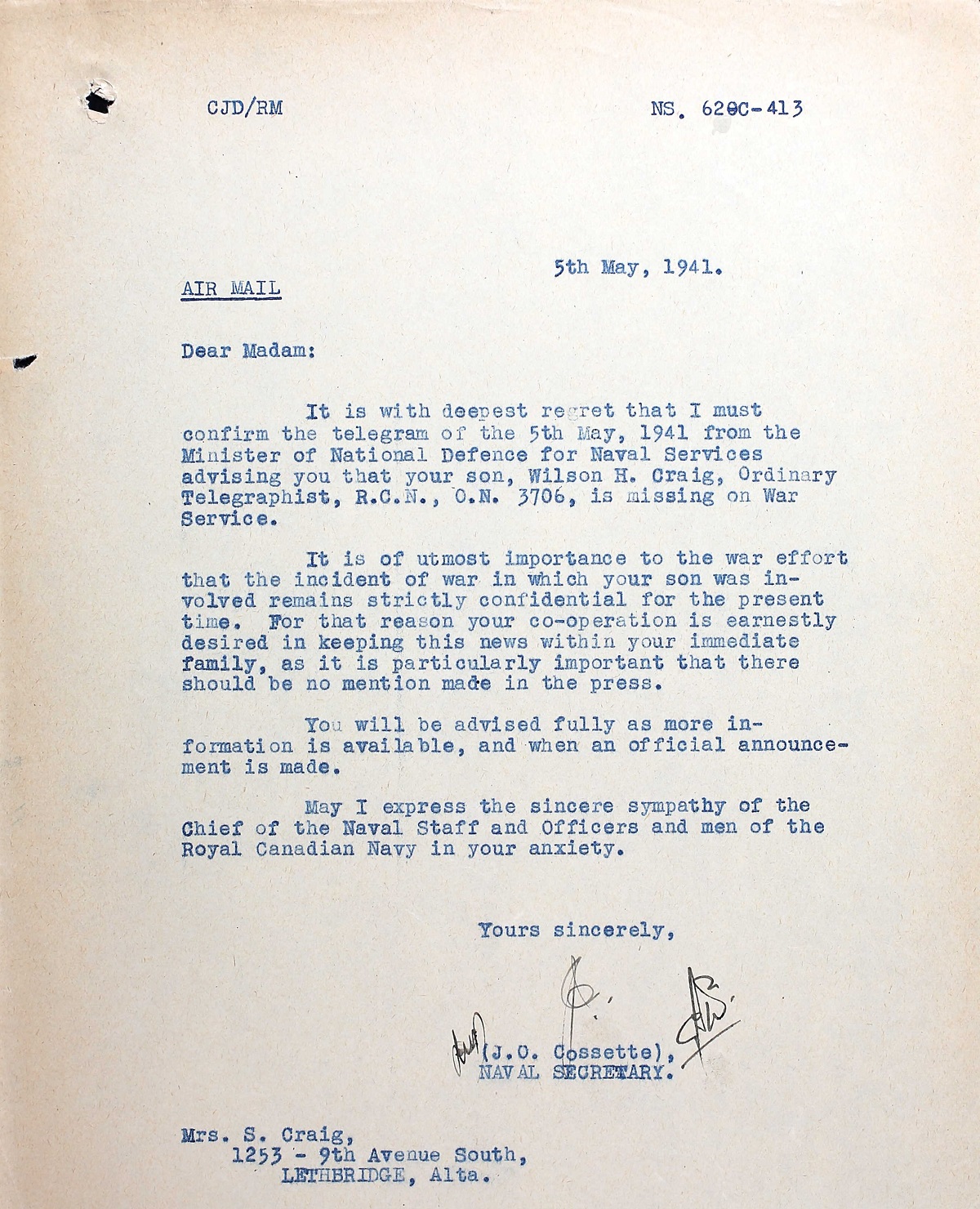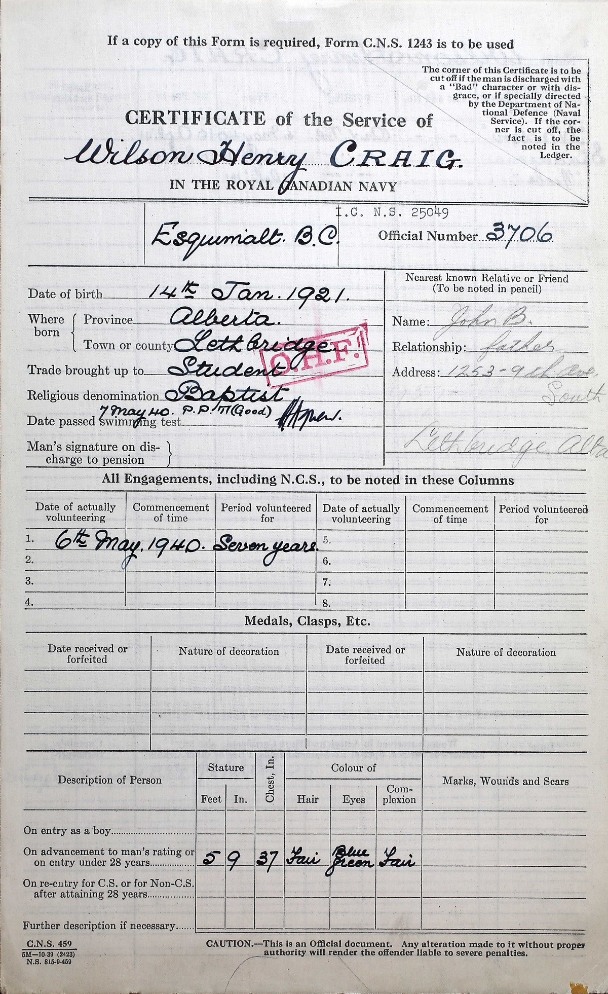CRAIG, Wilson Henry, O/Tel, 3706, RCN, MPK - 01 May 1941, S.S. NERISSA (Troopship) - Son of John B. and Sarah Craig, of Lethbridge, Alberta.