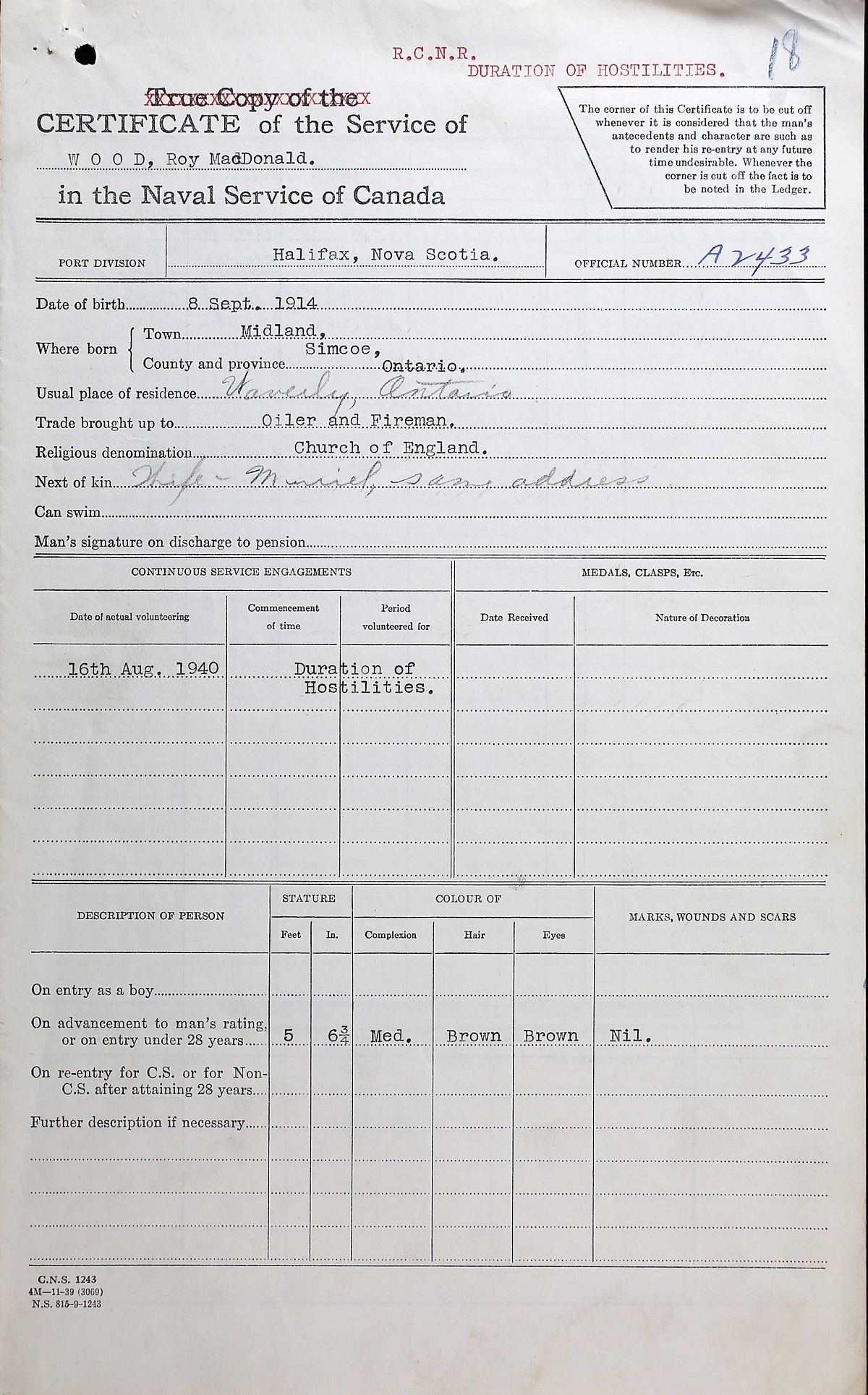 Roy MacDonald Wood, first-class stoker on board the Jervis Bay, is missing and believed killed in action, has been received here by his bride of six months. Wood sailed with the Jervis Bay from Halifax on Aug. 26. He sailed on the Great Lakes for five years previous to that. His parents, Mr. and Mrs. John Wood, reside at Waverley, Ontario. There are three brothers, Lloyd, Lester and Wallace, who are all Great Lakes sailors. Another brother, Ivan, lives in Midland. Wood was born in September 1914, and attended the Anglican Church at Waverley. (The Globe and Mail 14 Nov 1940)