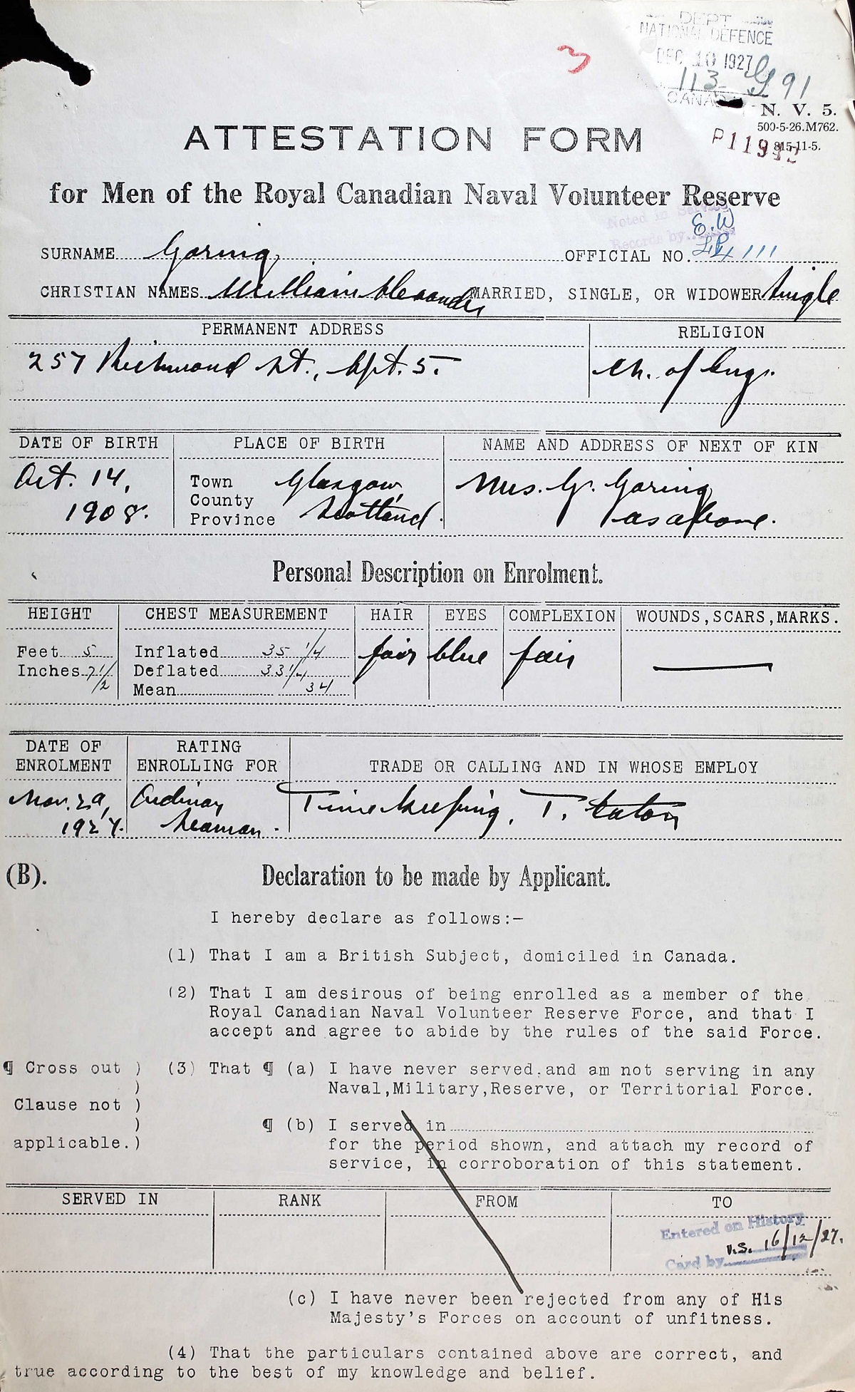 Ships served in: MONTREAL "A" COMPANY, RCNVR - Enlisted 29 Nov 1927 and served until Feb 1930 MONTREAL DIVISION RCNVR - Enlisted 30 May 1940 as an AB, RCNVR HMCS STADACONA - Drafted to STADACONA 06 Jun 1940 as an AB, RCNVR HMCS SAGUENAY - Drafted to SAGUENAY 19 Jun 1940 as an AB, RCNVR
