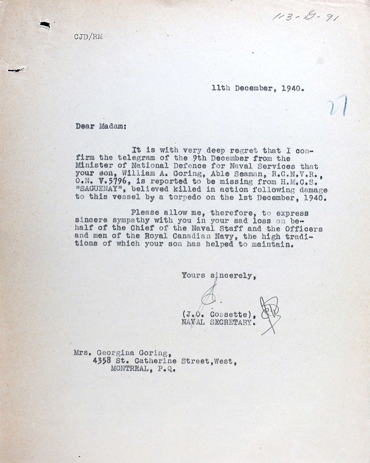 GORING, William Alexander, AB, V5796, RCNVR, killed - 01 Dec 1940, HMCS SAGUENAY - Son of Edwin and Georgina Goring, of Montreal, Quebec.