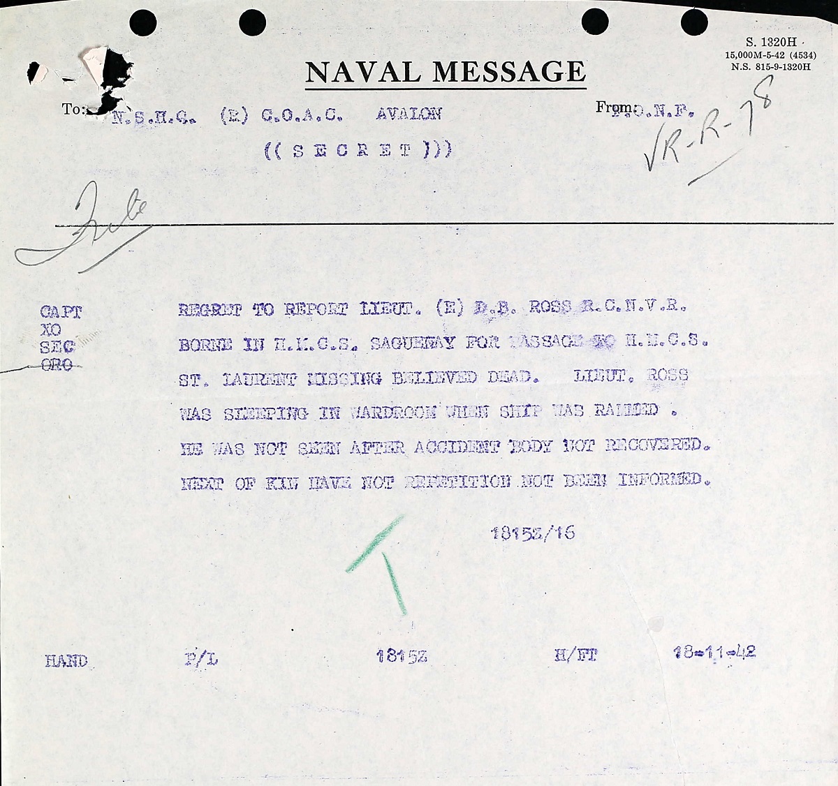 Ships served in: (Royal Canadian Navy) * Transferred to the RCNVR 30 Jan 1942 HMCS NIOBE - Appointed to NIOBE 30 Jan 1942 as a Lt (E), RCNVR HMCS OTTAWA - Served in OTTAWA 25 Feb 1942 - 08 Mar 1942 as a Lt (E), RCNVR HMCS MAHONE - Served in MAHONE 07 Apr 1942 - 06 Nov 1942 as a Lt (E), RCNVR HMCS STADACONA - Appointed to STADACONA 07 Nov 1942 as a Lt (E), RCNVR for disposal HMCS ST LAURENT - Appointed to ST LAURENT as add'l 13 Nov 1942 as a Lt (E), RCNVR, in charge of machinery. Appointment to commence of date of joining ship. HMCS SAGUENAY - Lt (E) Ross was onboard SAGUENAY for passage from Halifax to join ST LAURENT in St. John's, Nfld when he was killed