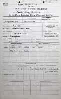 Ships served in: VANCOUVER DIVISION RCNVR - Enlisted 18 Apr 1939. Commenced Active Service 04 Sep 1939 HMCS NADEN for Cole Island - Drafted to Cole Island 04 Sep 1939 as an OS, RCNVR HMCS NADEN - Drafted to NADEN 11 Mar 1940 as an OS, RCNVR HMCS SALTPETER - Drafted to SALTPETER 13 Mar 1940 as an OS, RCNVR HMCS SPARTEN III - Drafted to SPARTEN III 18 Mar 1940 as an OS, RCNVR HMCS NADEN - Drafted to NADEN 26 Apr 1940 as an OS, RCNVR HMCS ARMENTIERES - Drafted to ARMENTIERES 29 Apr 1940 as an OS, RCNVR HMCS NADEN - Drafted to NADEN 24 May 1940 as an OS, RCNVR HMCS SANS PEUR - Drafted to SANS PEUR 06 Jul 1940 as an OS, RCNVR HMCS NADEN - Drafted to NADEN 03 Aug 1940 as an OS, RCNVR HMCS PRINCE ROBERT - Drafted to PRINCE ROBERT 12 Sep 1940 as an OS, RCNVR HMCS NADEN - Drafted to NADEN 15 May 1941 as an OS, RCNVR HMCS PRINCE HENRY - Drafted to PRINCE HENRY 08 Aug 1941 as an OS, RCNVR HMCS STADACONA - Drafted to STADACONA 30 Dec 1941 as an OS, RCNVR HMCS AVALON - Drafted to AVALON 23 Jan 1942 as an OS, RCNVR HMCS SHEDIAC - Drafted to SHEDIAC 03 Jul 1942 as an OS, RCNVR HMCS STADACONA - Drafted to STADACONA 08 Aug 1942 as an OS, RCNVR HMCS REGINA - Drafted to REGINA 14 Aug 1942 as an OS, RCNVR * Rated AB 04 Nov 1942