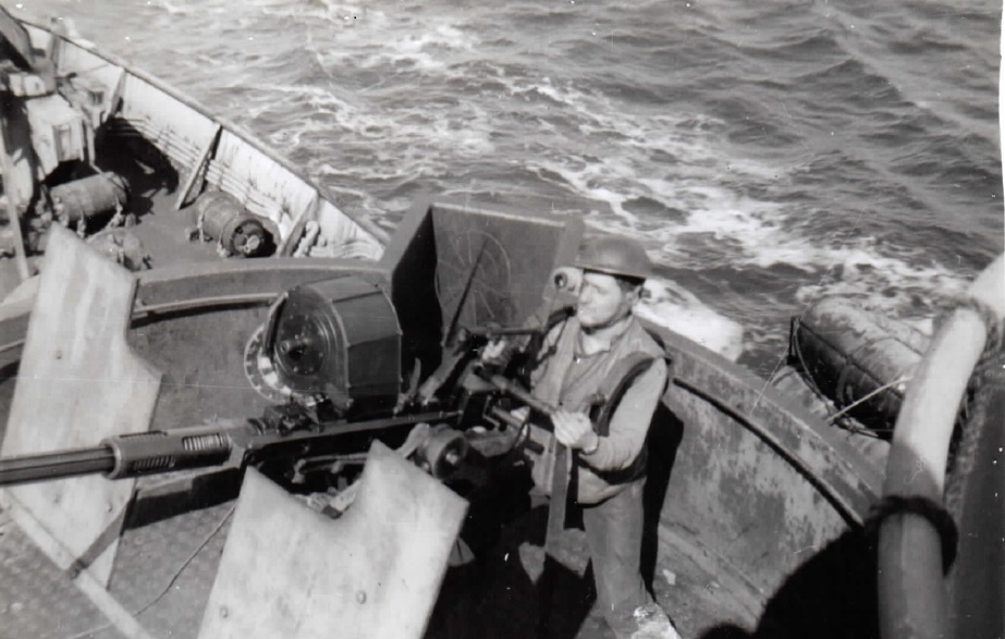 (GZ28) HMCS ROSTHERN Winter 1942 - How's this for ice. Newfie Winter 1942. That is our main gun shield I'm (Gerry Zaphe) leaning on. the whole ship is covered in ice - the greatest danger is that it could roll over from the weight (GZ29) HMCS ROSTHERN - Newfie - 1942 - More ice just the the entrance to the Seamen's Mess - Notice life lines for hanging on in rough weather. That's me (Gerry Zaphe) in the picture (GZ30-GZ31) HMCS ROSTHERN 1942 - Taking on fuel from a tanker half way across. This was necessary cause we sure burned a lot of oil chasing U-boats all night long at full speed. We did this about 3 or 4 times a trip so we were always at "Full Ready" (GZ32) This is our forward gun. It was built by the Massey Harris Farm Implement Co. in Ontario - so says a brass plate on it. We call it "The Massey Harris"