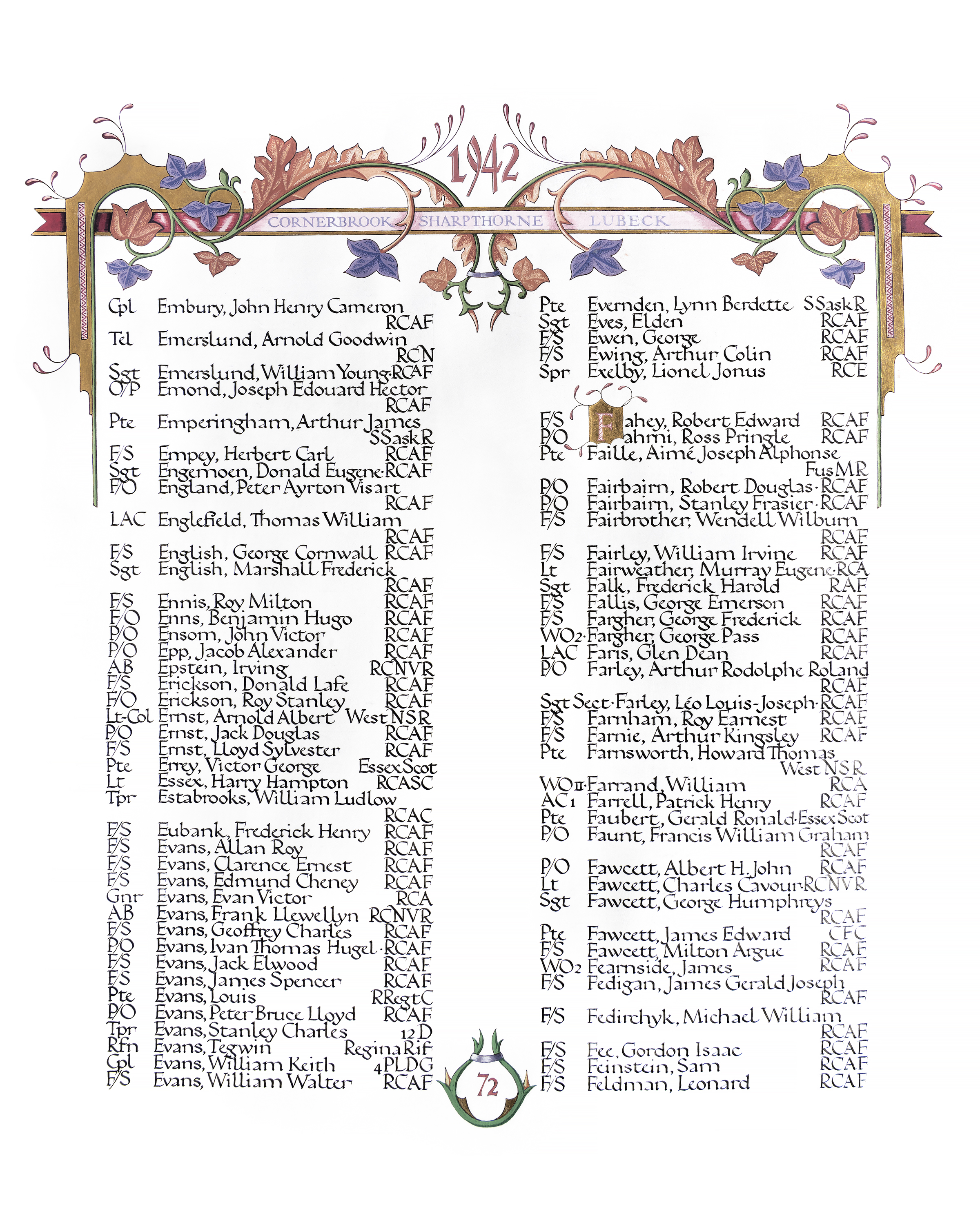 Lt Fawcett died when his ship, HMCS SPIKENARD, was torpedoed and sunk by U-136, about 465 nautical miles west of Malin Head, Ireland while escorting convoy SC-67. Of her crew of 65, there were only 8 survivors.