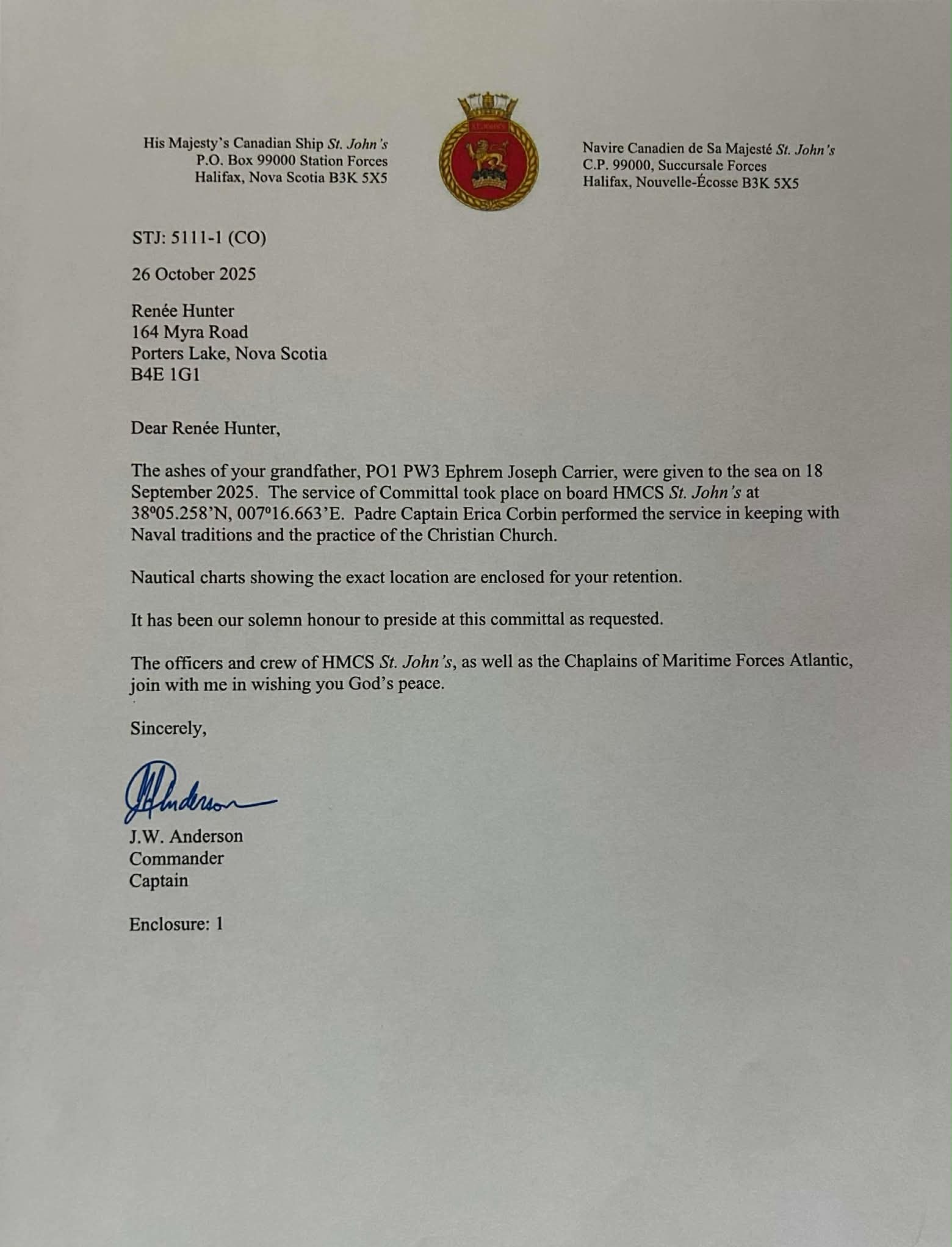 Letter and map to Renée Hunter from HMCS ST JOHN'S on the committal of ashes of PO1 Ephram Carrier to the sea from HMCS ST. JOHN'S.
