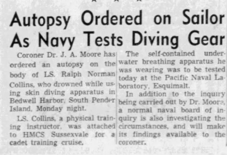 Leading Seaman Collins joined the RCN 23 Mar 1953 in New Westminster, BC. He died as a result of a diving accident during a recreational dive from the ship near Pender Island BC.